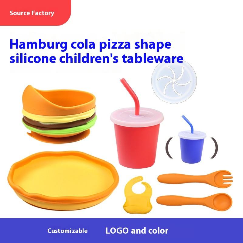 Juego de Vajilla Infantil de Silicona Ecológica con Dibujos Animados, Incluye Plato, Babero, Tazón y Vaso para Hamburguesas y Pizza