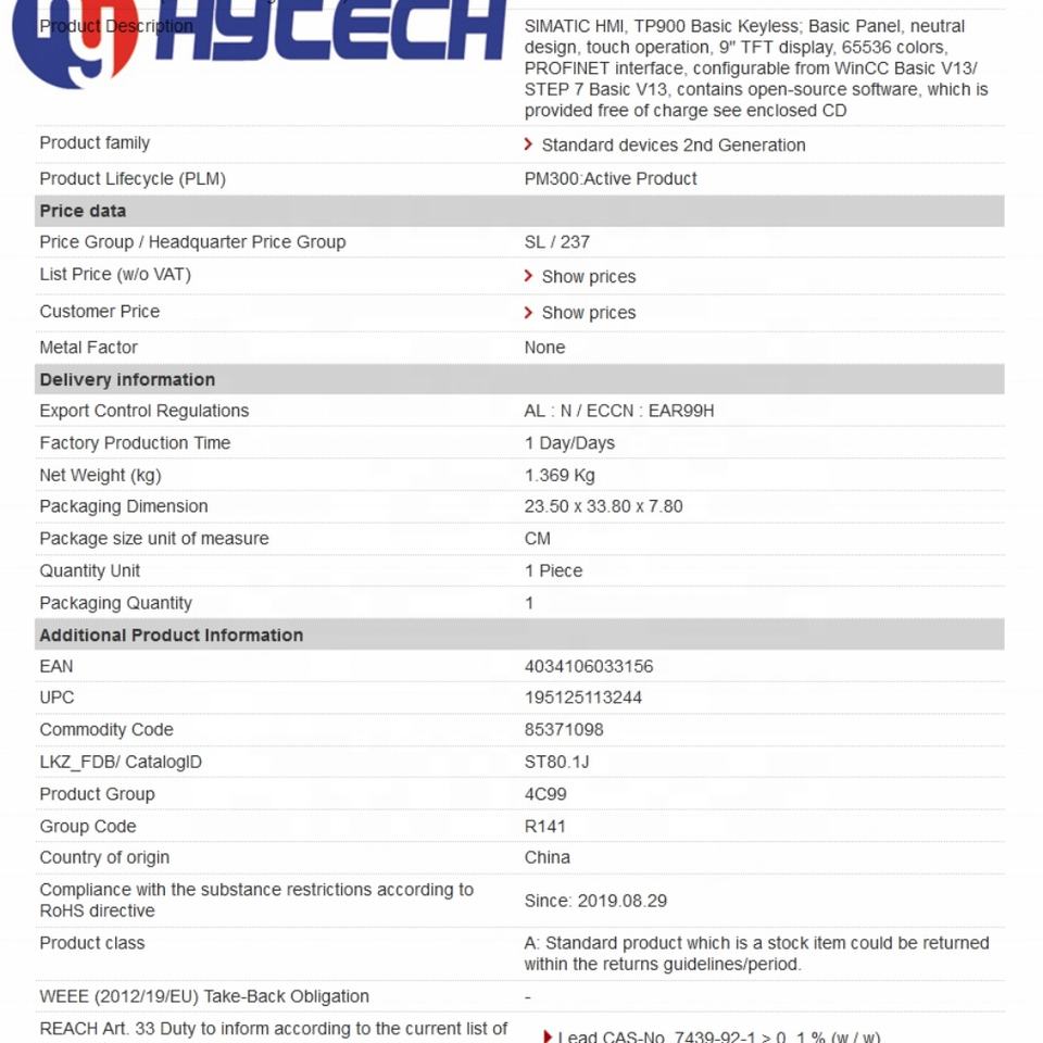 Nombre del producto:SIMATIC HMI TP900 Básico sin llave
