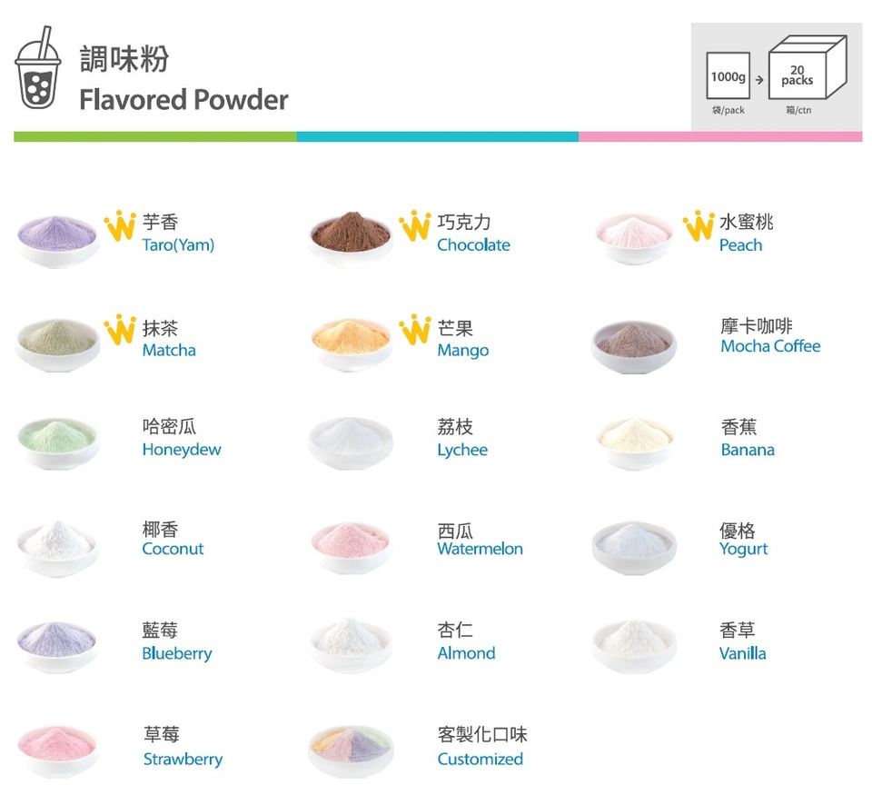 Taro, Strawberry, Matcha,Coconut, Mango, Honeydew, Blueberry