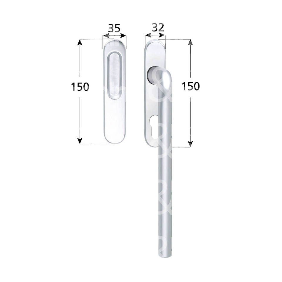 MANGO DE ELEVACIÓN REDONDO SIMPLE Con placa de orificio Yale y nicho Longitud 250 mm Dimensiones de la placa 35x150mm Acabado plateado