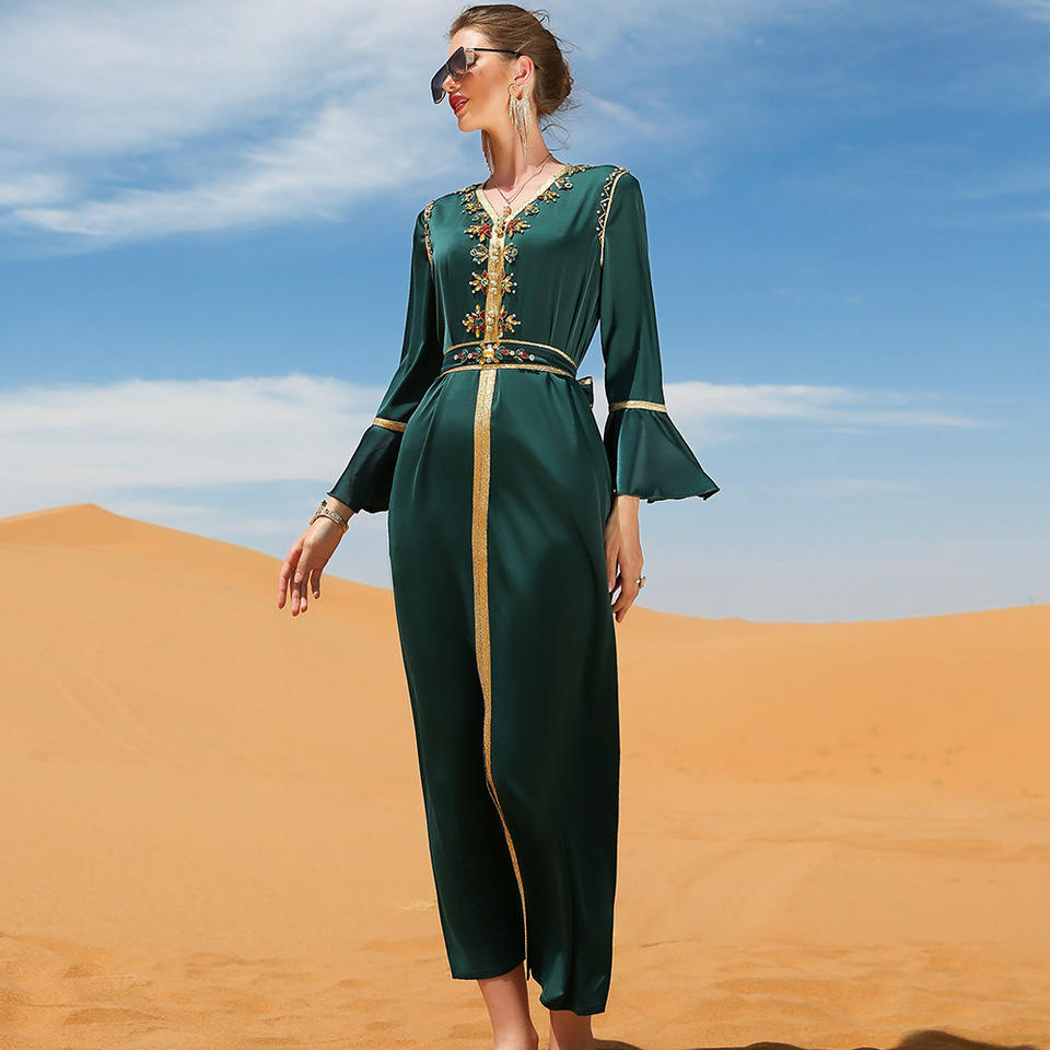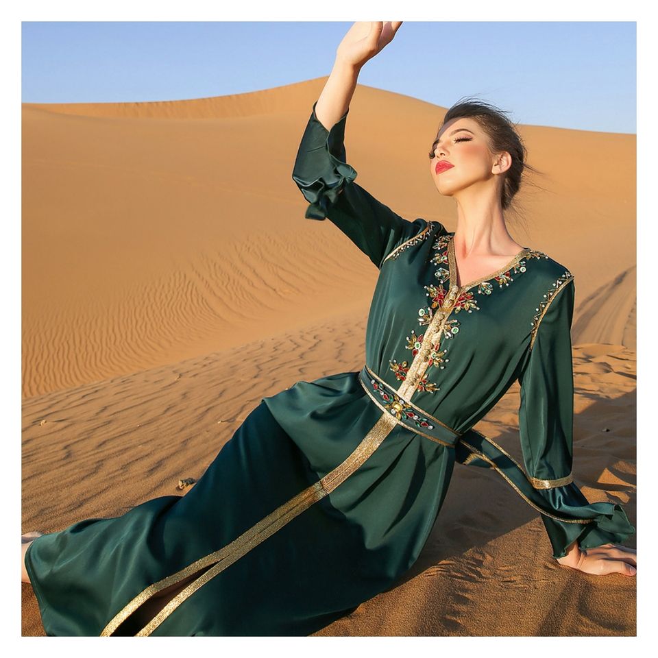 SIPO Eid-tela satinada Abaya básica islámica con cinturón para mujer, Abaya de diseño bordado con abalorios