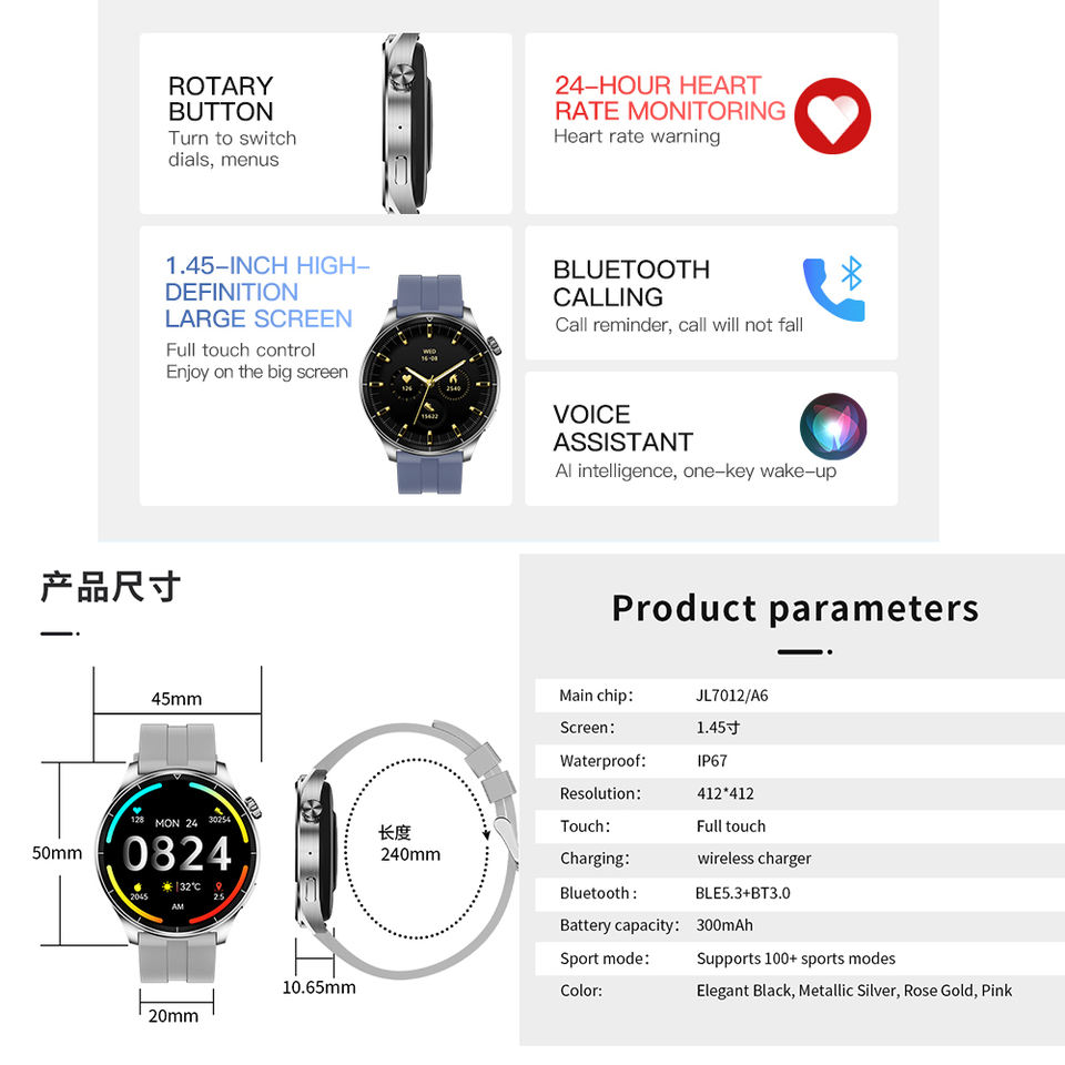 Función:Reloj despertador, seguimiento de forma, Monitor de ritmo cardíaco, Recordatorio de mensajes, Podómetro, Mensaje emergente, Control remoto, Rastreador de sueño, Cronógrafo, Hora mundial, Control de gestos, Recordatorio de llamada, Calendario, Reserva de marcha, Seguimiento del estado de ánimo, Respuesta telefónica, Marcar llamada