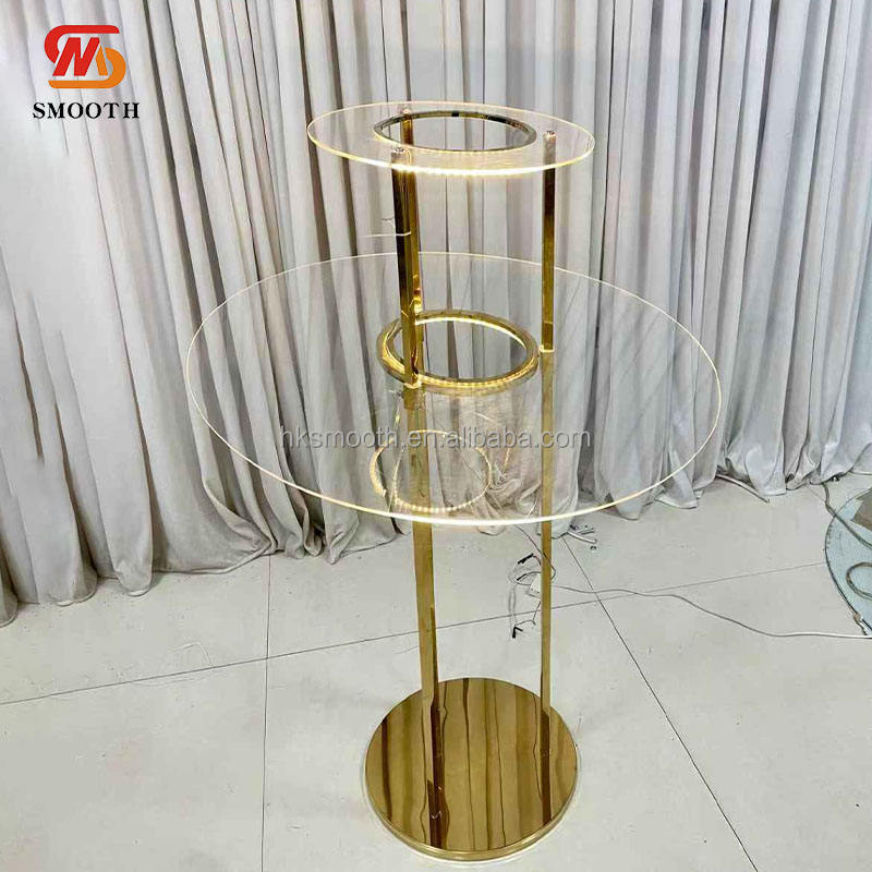Nombre del producto:Centro de mesa floral circular acrílico con soporte de metal dorado y luz.