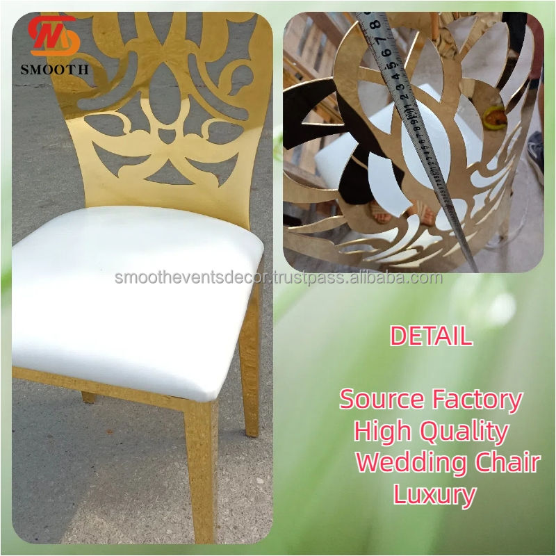 Suave apilable de lujo elegante diseño trasero jardín oro fiesta de acero inoxidable Hotel fiesta banquete Silla de boda