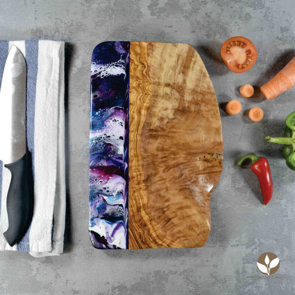 Tabla de Cortar de Madera de Olivo de Lujo Hecha a Mano SOLOBEAT con Resina Epoxi Decorativa, Tabla para Servir, Mueble de Cocina