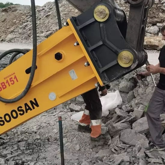 Martillo hidráulico tipo caja SOOSAN SB151 con características estándar incluidas y un mes de garantía