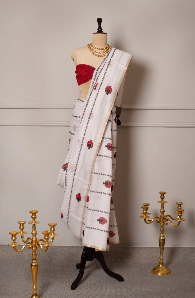 SOOT RAAG Sari y blusa de lino de corte ajustado moderno estampado blanco y rojo para traje de fiesta de boda para sesión de fotos