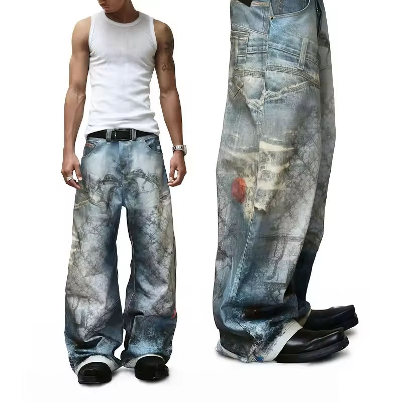 Jeans de Mezclilla Holgados de Pierna Recta, Estilo Vintage Desgastado, con Estampado DTG y Parches, para Hombre, de SPORTISH IMPEX