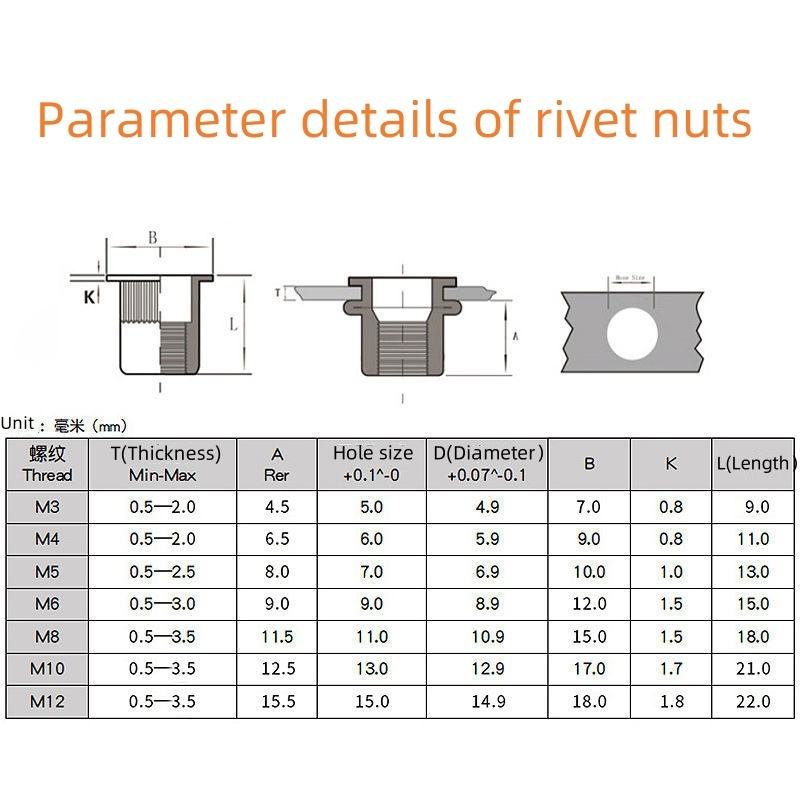 Nombre del producto:Tuerca de remache ciega con cabeza plana, roscada, tipo Nutsert, de acero inoxidable 304
