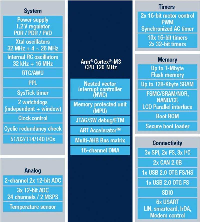 Periféricos:Detección/reinicio de caída de tensión, DMA, I2S, LCD, POR, PWM, WDT