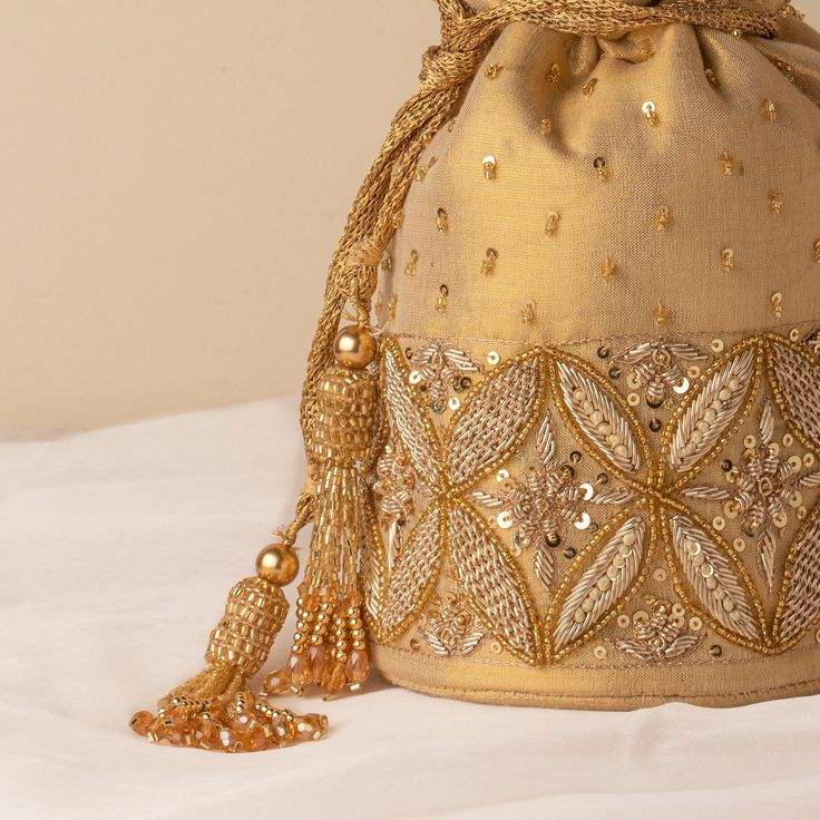 2024 Impresionante diseño bordado de seda cruda Potli Bags Party-Wear/Wedding Wear con cuentas de cristal Perlas Elegantes bolsos de noche