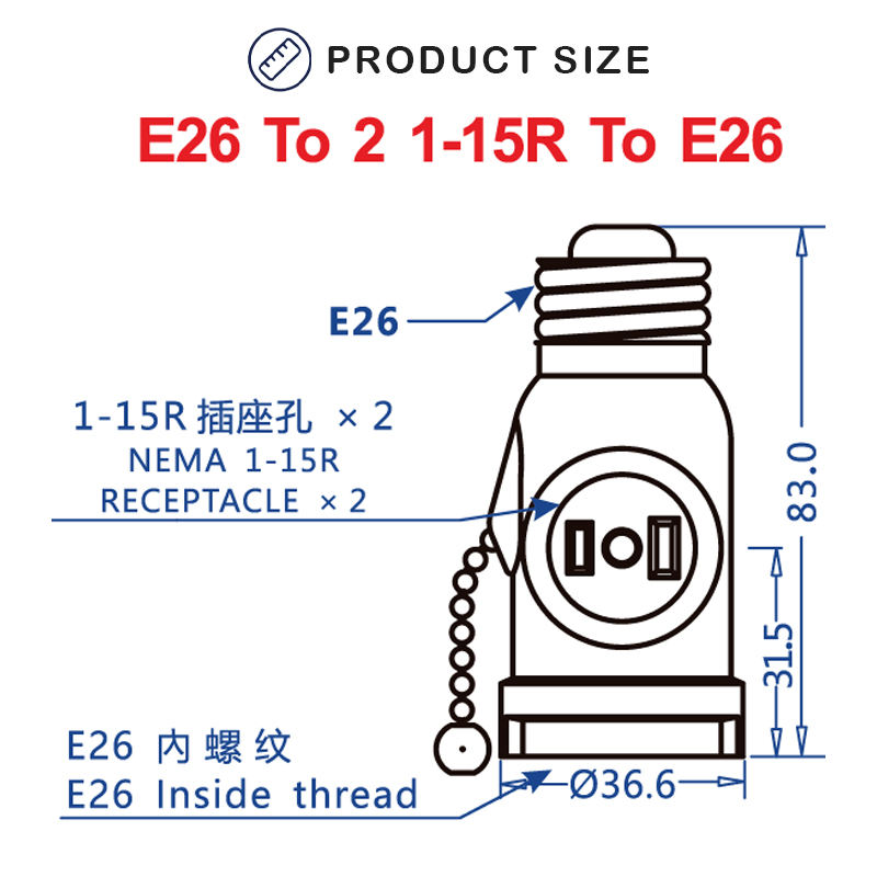 Adaptador de Portalámparas SUN LITE E26 - Convierte un Portalámparas de Rosca Mediana en Dos Tomas de Corriente con Interruptor de Cadena