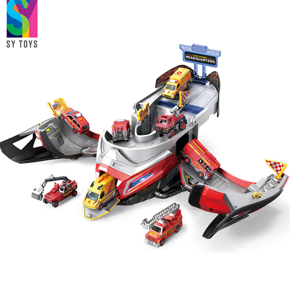 SY TOYS Factory, multifunción, ciudad para niños, tema de fuego, casco de carreras fundido a presión, pista de coche y estacionamiento, juguetes de almacenamiento