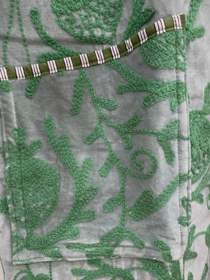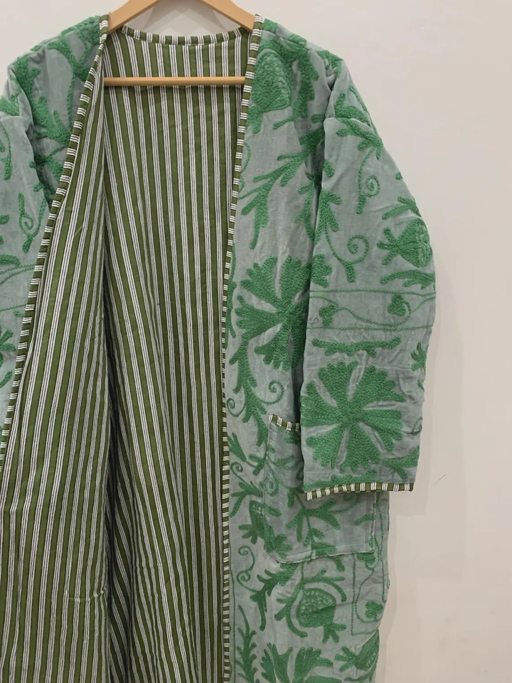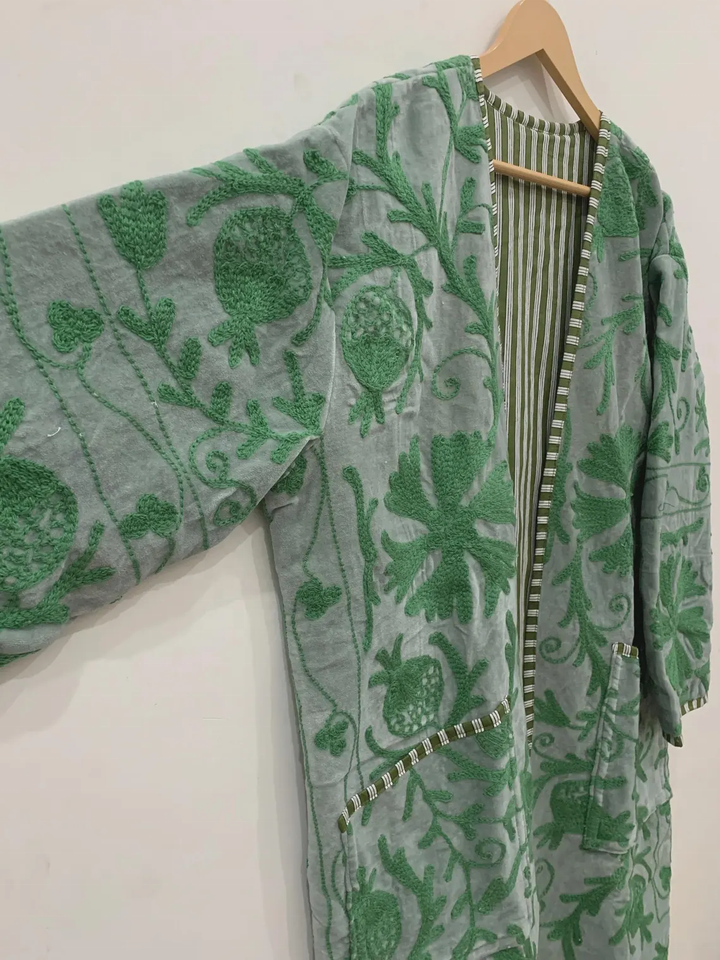 Kimono Suzani Verde Salvia Hecho a Mano, Chaqueta Larga Acolchada de Terciopelo para Mujer, Abrigo Bohemio con Bordado Floral