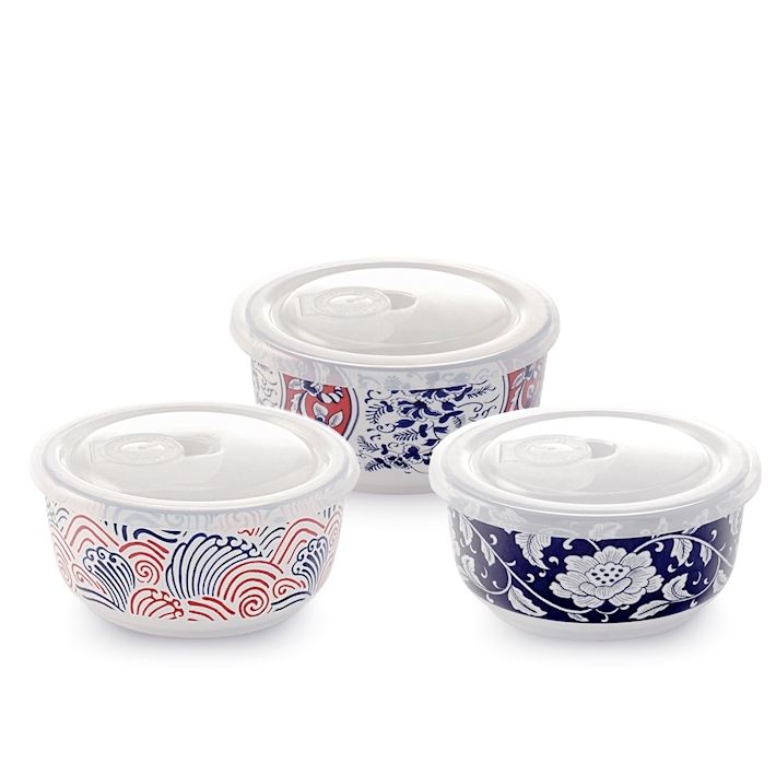 Contenedor de Almacenamiento de Alimentos Sakura con Tapa, 13x7cm, Juego de Tres Piezas con Diseño Decorativo para Uso en la Cocina