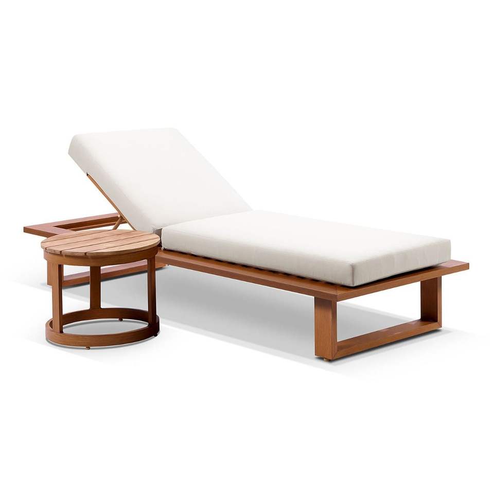 Descripción:Tumbona reclinable de madera maciza con cojín blanco