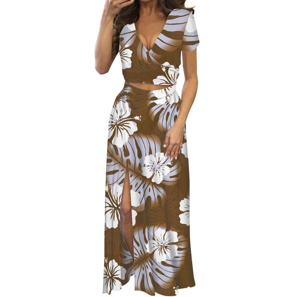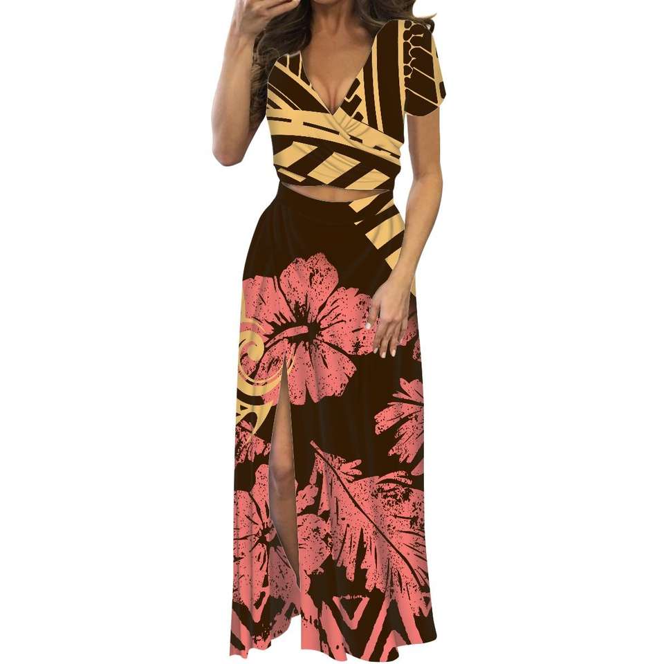 Conjunto de Dos Piezas con Estampado Tribal Geométrico Samoano para Mujer, Top Corto Cruzado con Cuello en V y Falda Maxi con Abertura Lateral, Vestido Tapa de las Islas del Pacífico