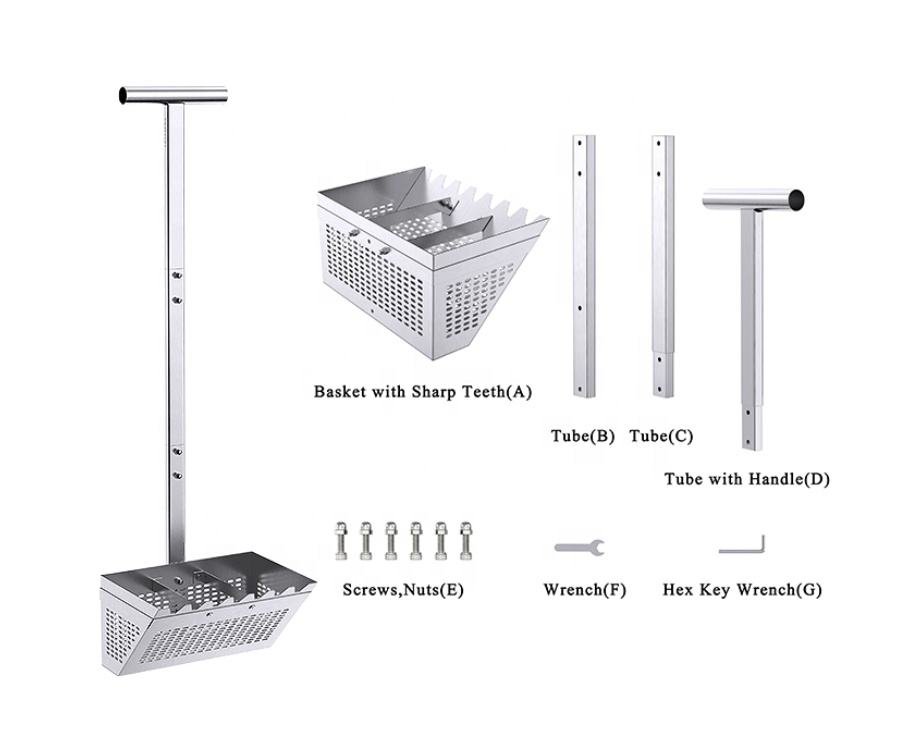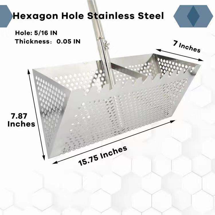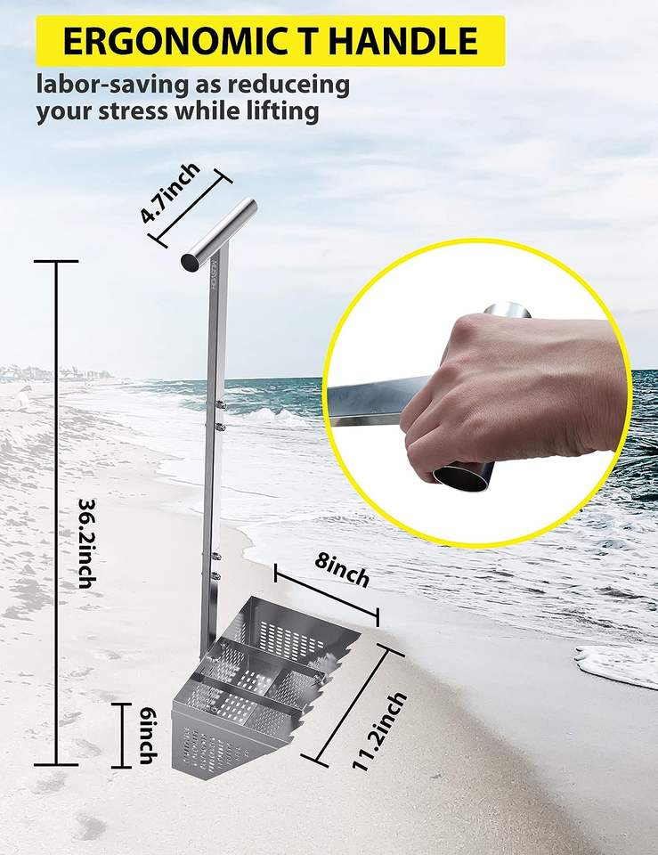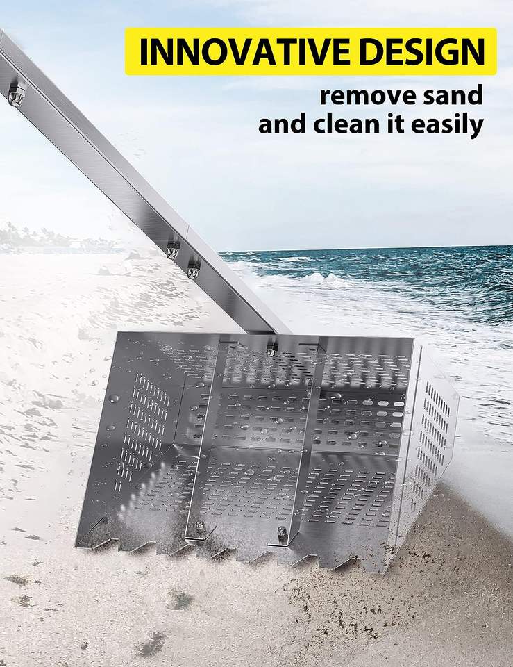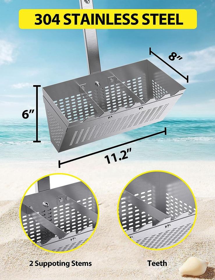 Rastrillo para ácaros de arena, rastrillo para ácaros de arena para la playa, cesta trapezoidal de 11.2'' de ancho con 2 varillas de soporte y dientes afilados, 36.2'' de largo