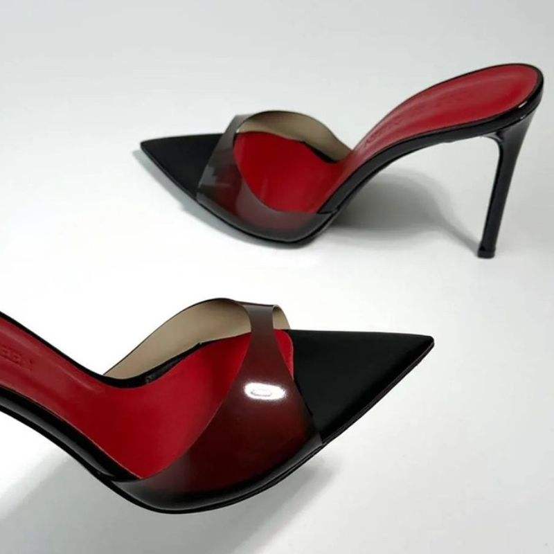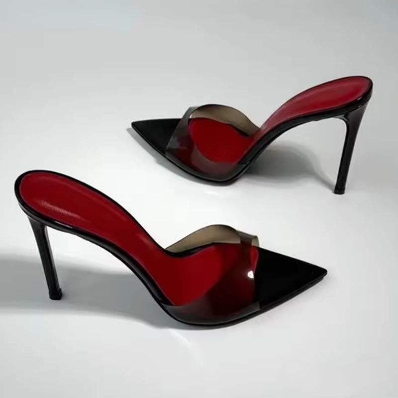 Sandalias de Tacón Alto para Mujer, Transparentes, de PVC, con Punta Puntiaguda, Estilo Mules, Tacón de Aguja, Plantilla Roja, Sandalias Deslizantes