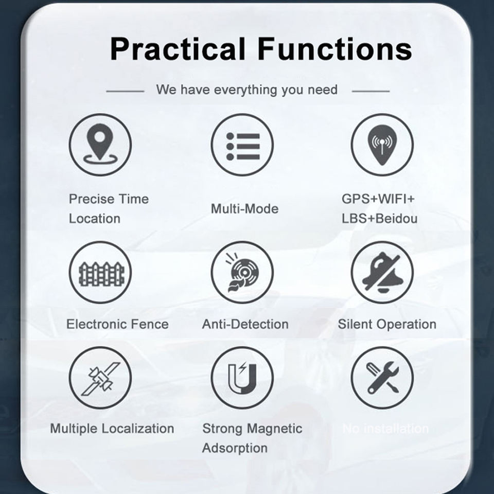 Reserva de marcha, seguimiento de forma, 24 horas de instrucción, Control remoto APP, Ubicación GPS, Modo de ahorro de energía, Seguimiento en tiempo real, Geo valla de alarma, Rastreador de sueño, Función personalizadaFunción
