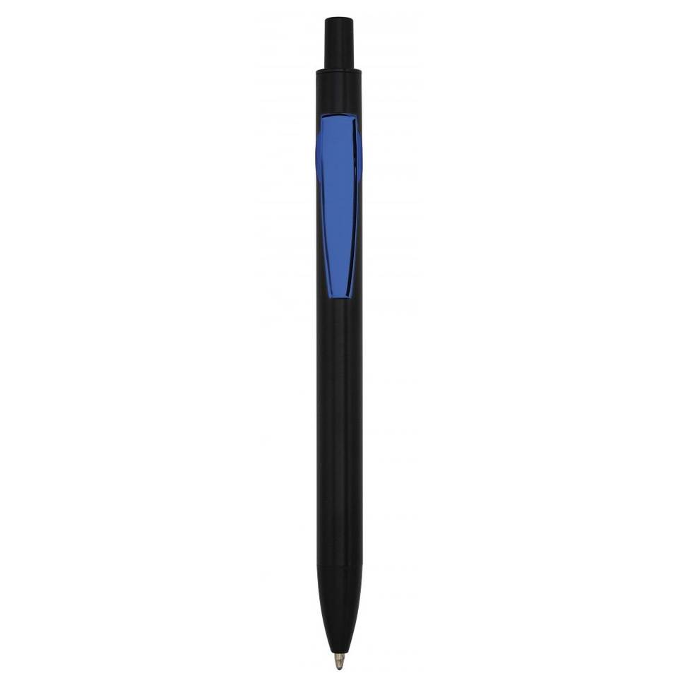 Bolígrafo promocional de metal pulido negro satinado y azul con cuerpo de acero y piezas de plástico, punta de plumas.