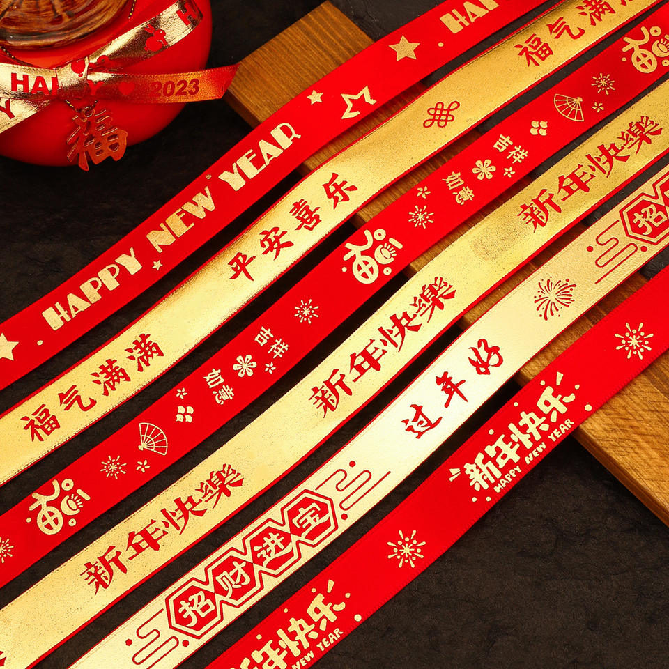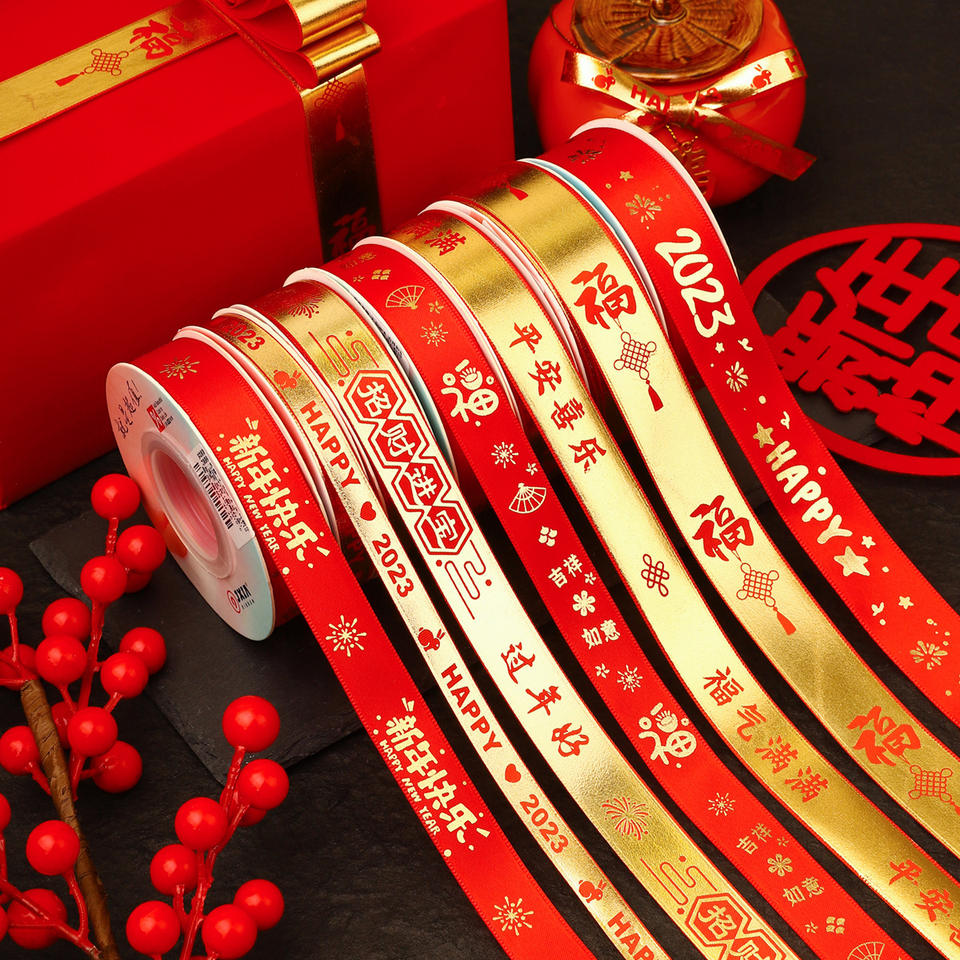 Satin Ribbon Spool 2023 New Year Decorations Red Gold Printed Craft Gift Wrapping Bow DIY Materials