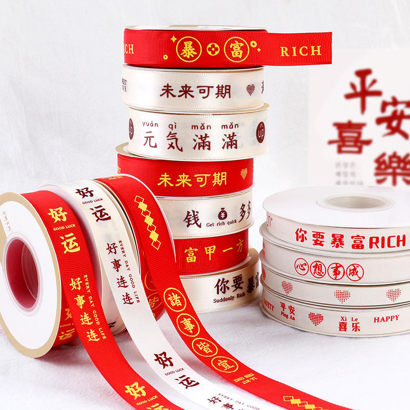 Satin Ribbon Spool Cotton 15mm Red Chinese Fortune Text For Gift Packaging Decorations