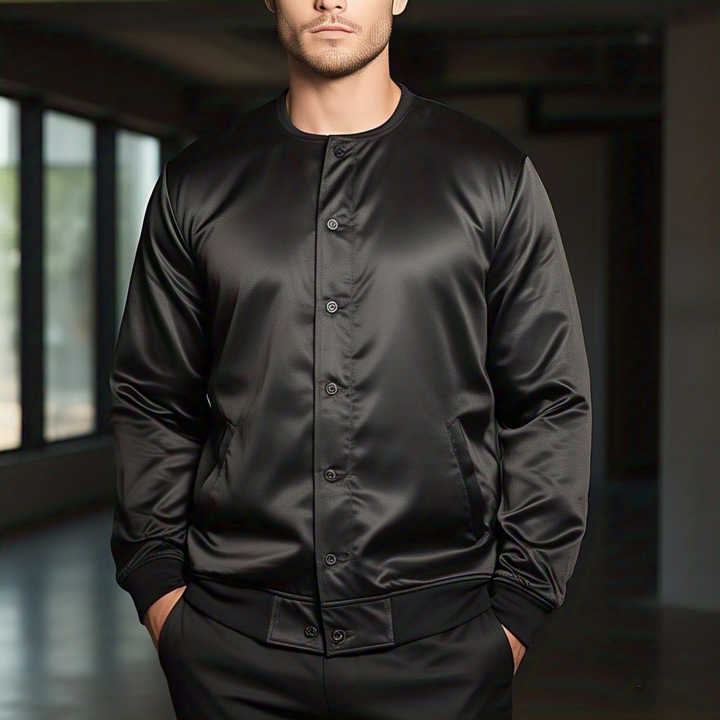 Chaqueta de seda satinada para hombre, chaqueta de bombardero de satén de seda Varsity personalizada, chaqueta de bombardero de satén negra a la moda para hombre