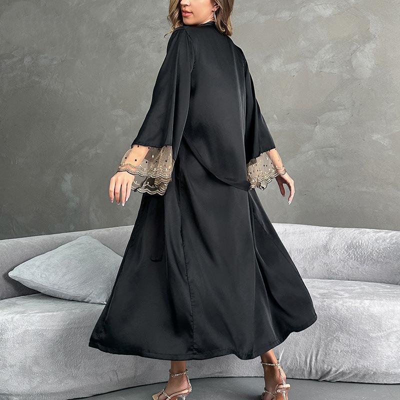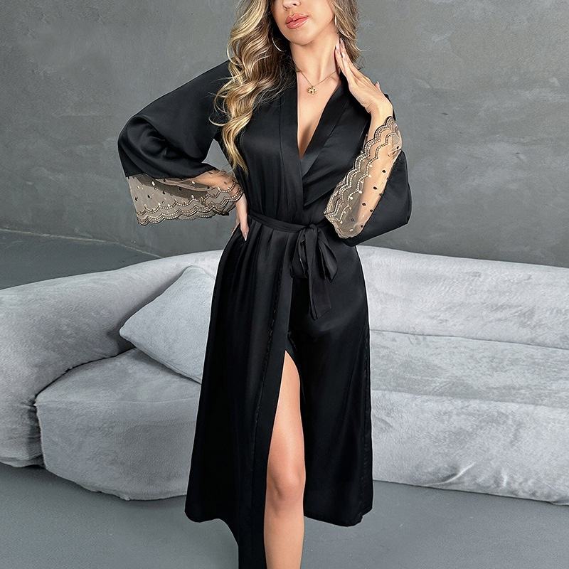 Bata de satén de seda con encaje en contraste, sexy, holgada, cómoda, de manga larga, ropa de dormir para mujer