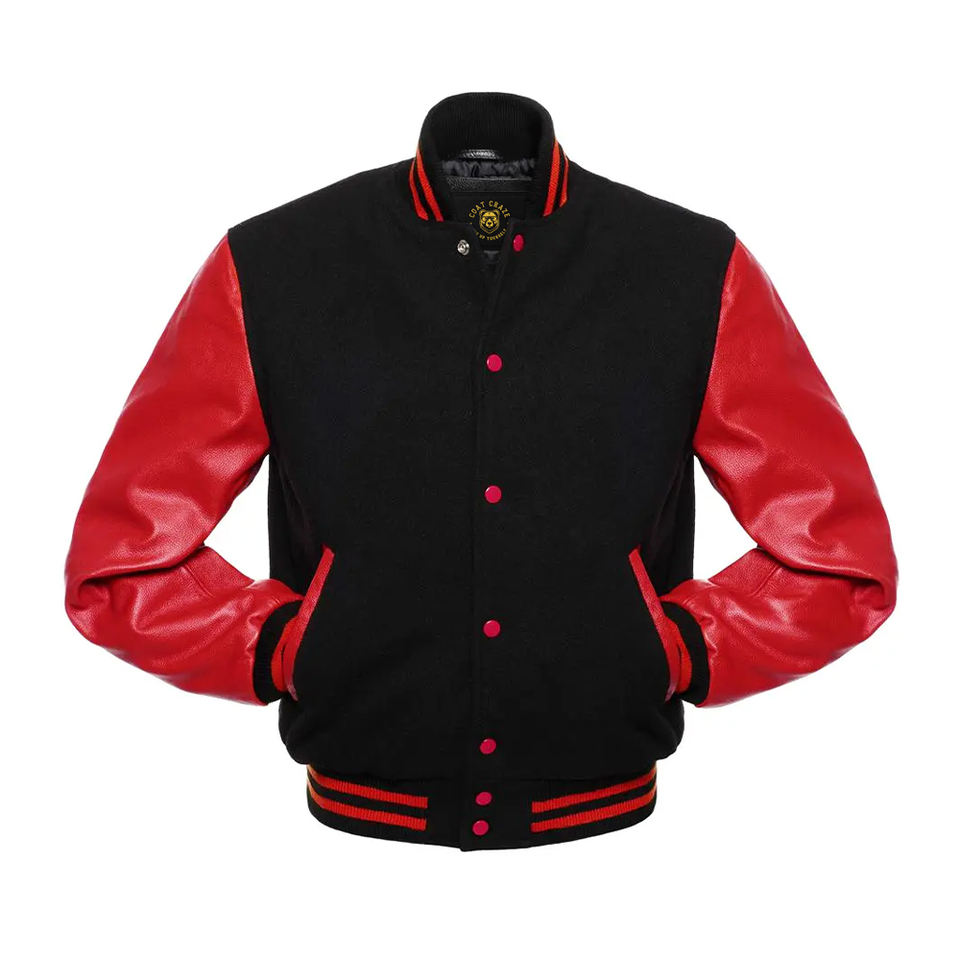 Chaqueta Bomber con Mangas de Cuero Rojo Escarlata y Cuerpo Negro, Chaqueta Universitaria con Mangas de Cuero