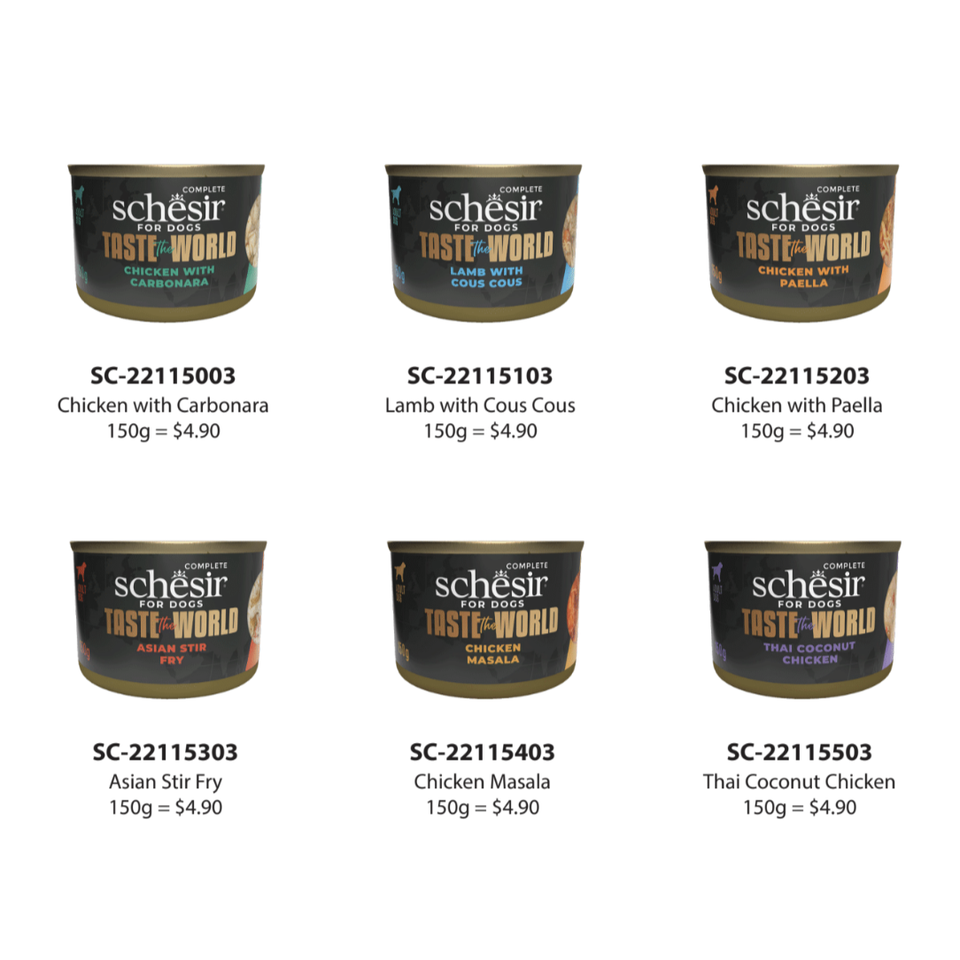Comida Húmeda Enlatada para Perros Schesir, Procesamiento Mínimo - Serie Sabores del Mundo (Lata de 150g) Pollo con Paella