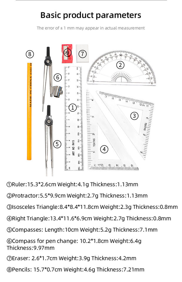Tipo de regla:Juego de reglas / Juego de reglas de plástico / Regla triangular / Regla recta