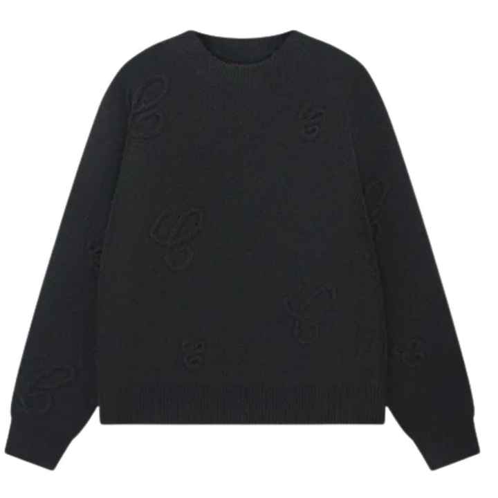Suéter de Punto con Apliques Script, Suéter Negro Bordado, Cuello Redondo Informal, Algodón Premium, Ropa de Invierno Cómoda, Moda Masculina