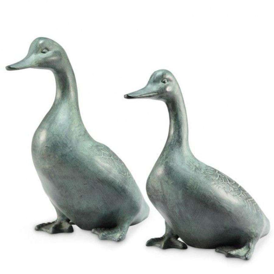 Estatua Decorativa de Pato para Jardín, Acabado Verde Pátina, Juego de 2 Esculturas de Patos, Decoración Rústica para Exteriores