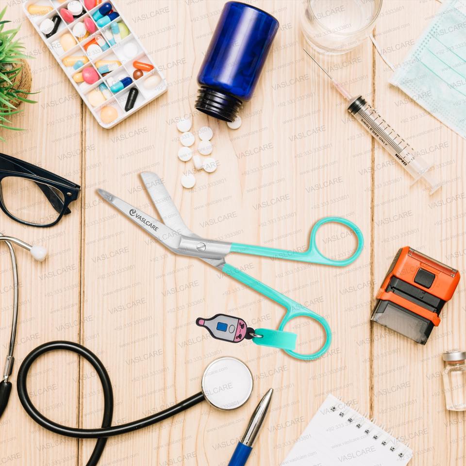 Tijeras Médicas Vaslcare Verde Mar con Bonito Llavero Termómetro, Punta Roma, Hojas Afiladas, Tijeras para Vendajes para Enfermeras