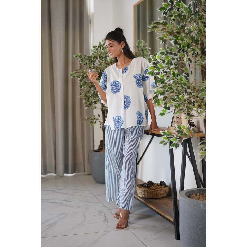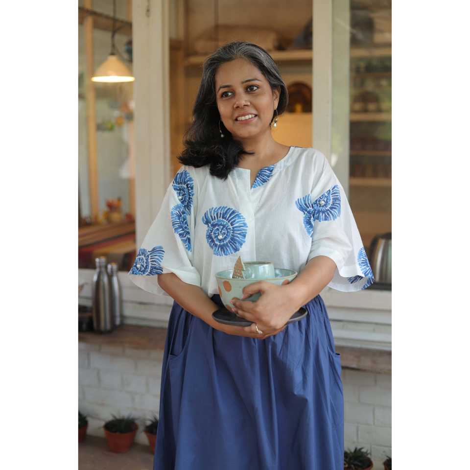 Top Holgado de Algodón Mulmul con Estampado de Remolinos Marinos y Detalles de Perlas, Color Azul Oscuro, Talla Única