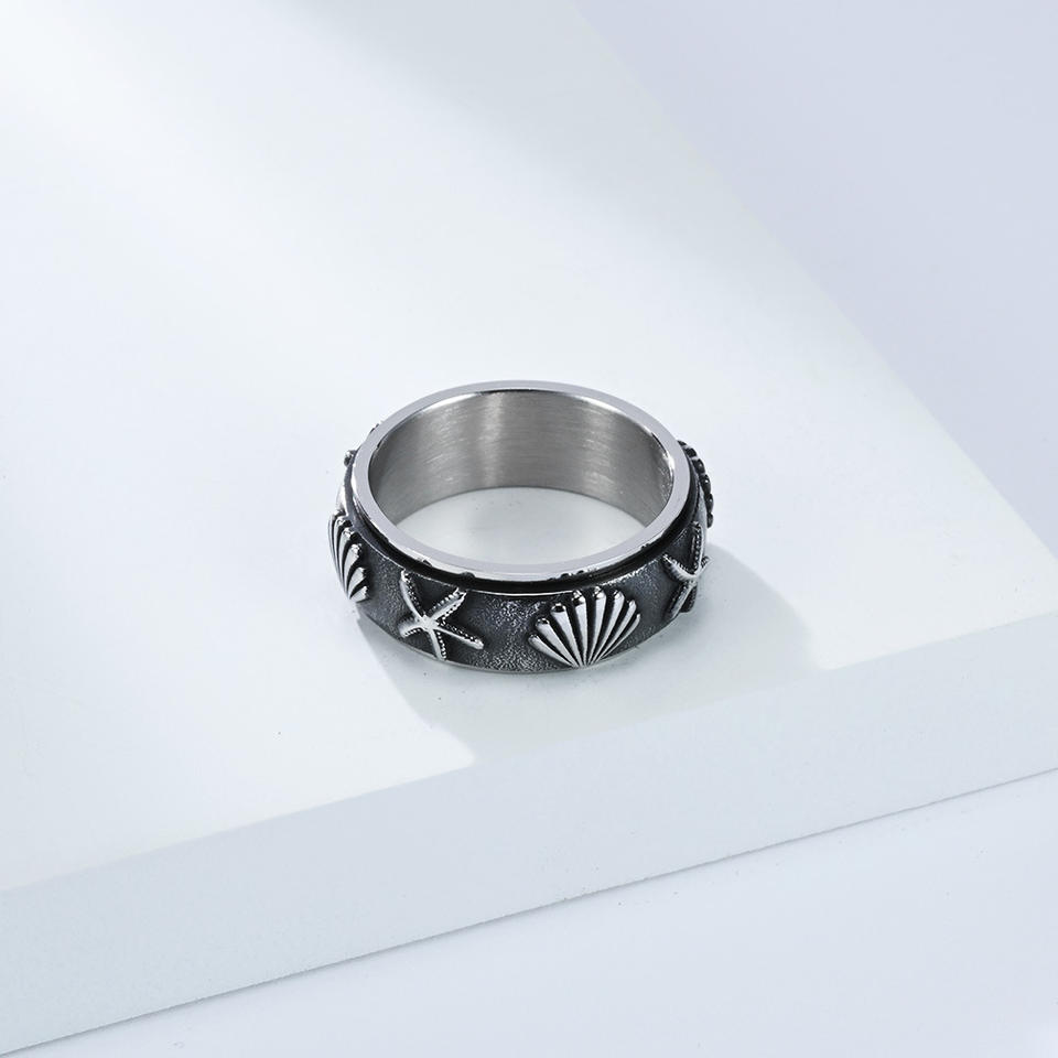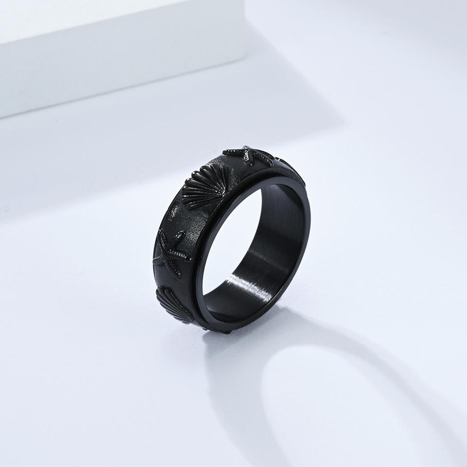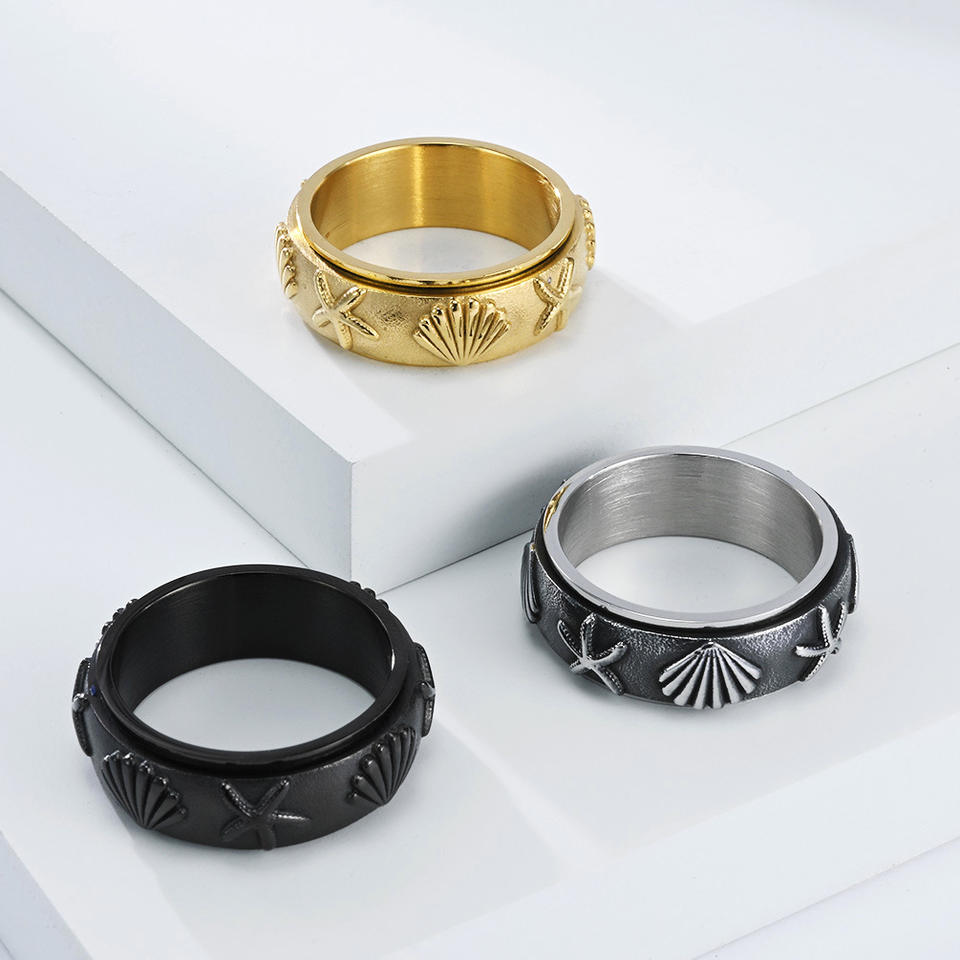 Anillo Giratorio de Concha Marina y Estrella de Mar, Dorado y Negro, de Acero, Unisex, Joyería con Temática Oceánica, Regalo, Anillo para el Dedo Índice