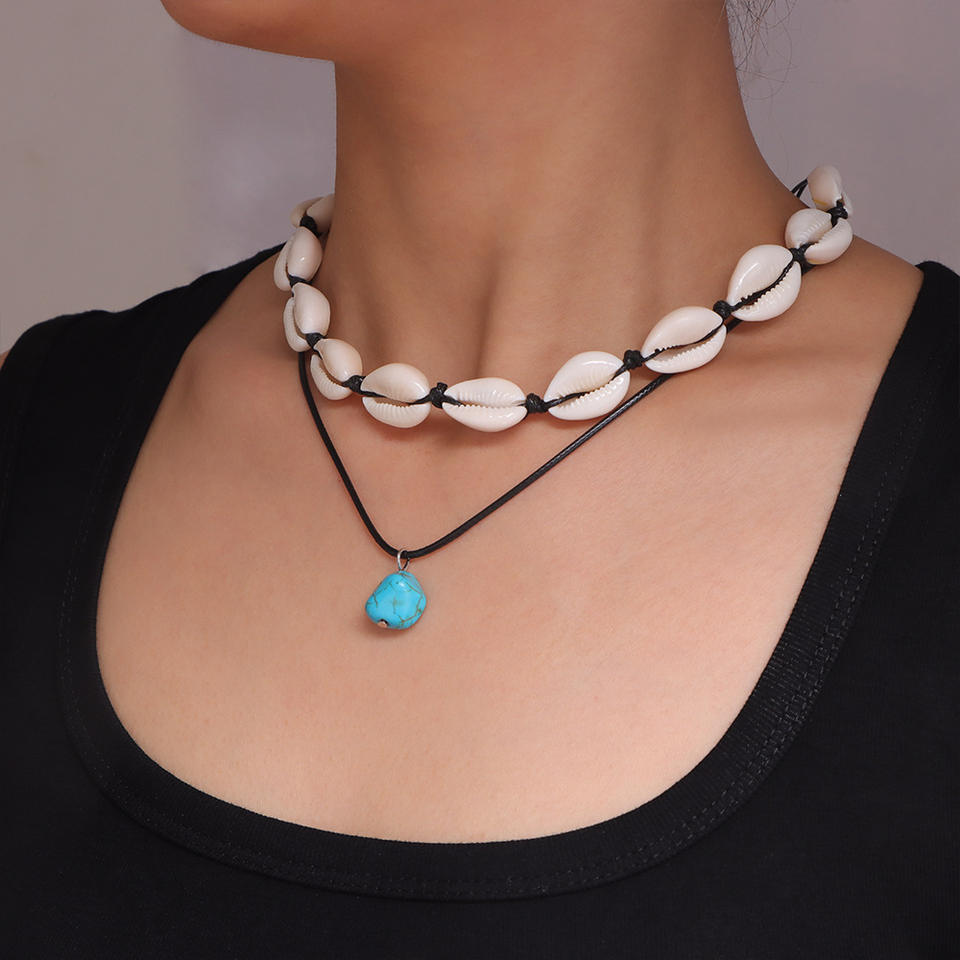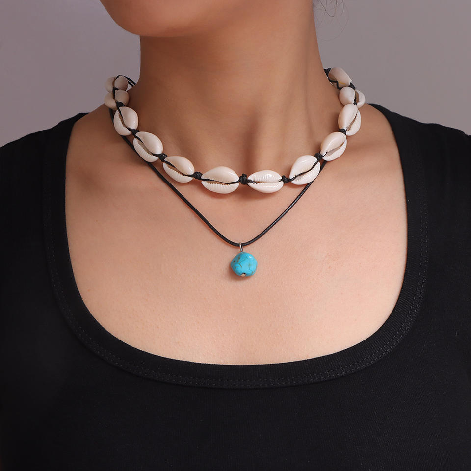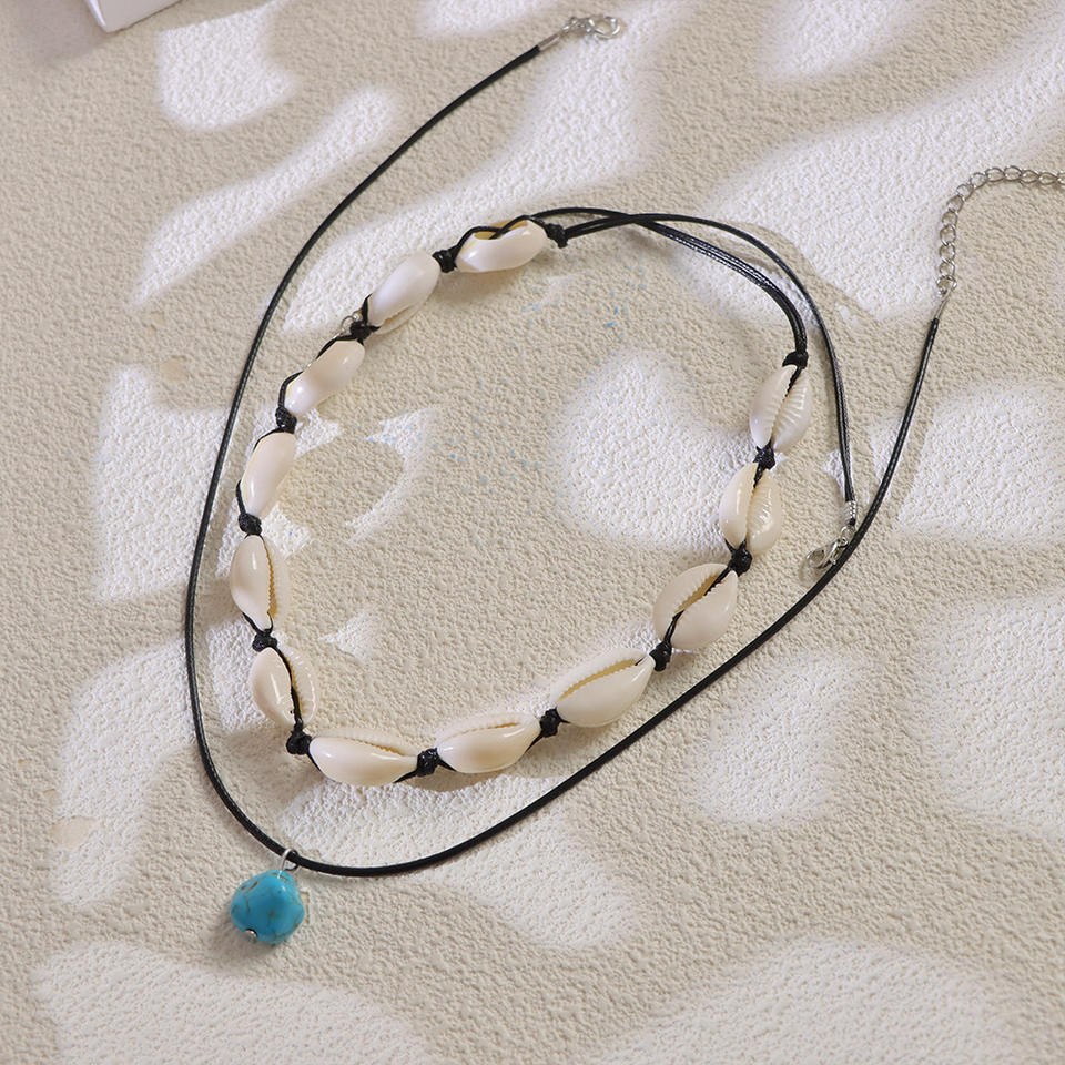 Collar de Conchas Turquesas con Cuerda Negra, Dos Piezas, Cadena para Clavícula para Mujer, Estilo Boho Minimalista para Fiestas