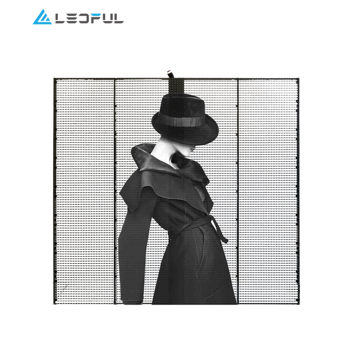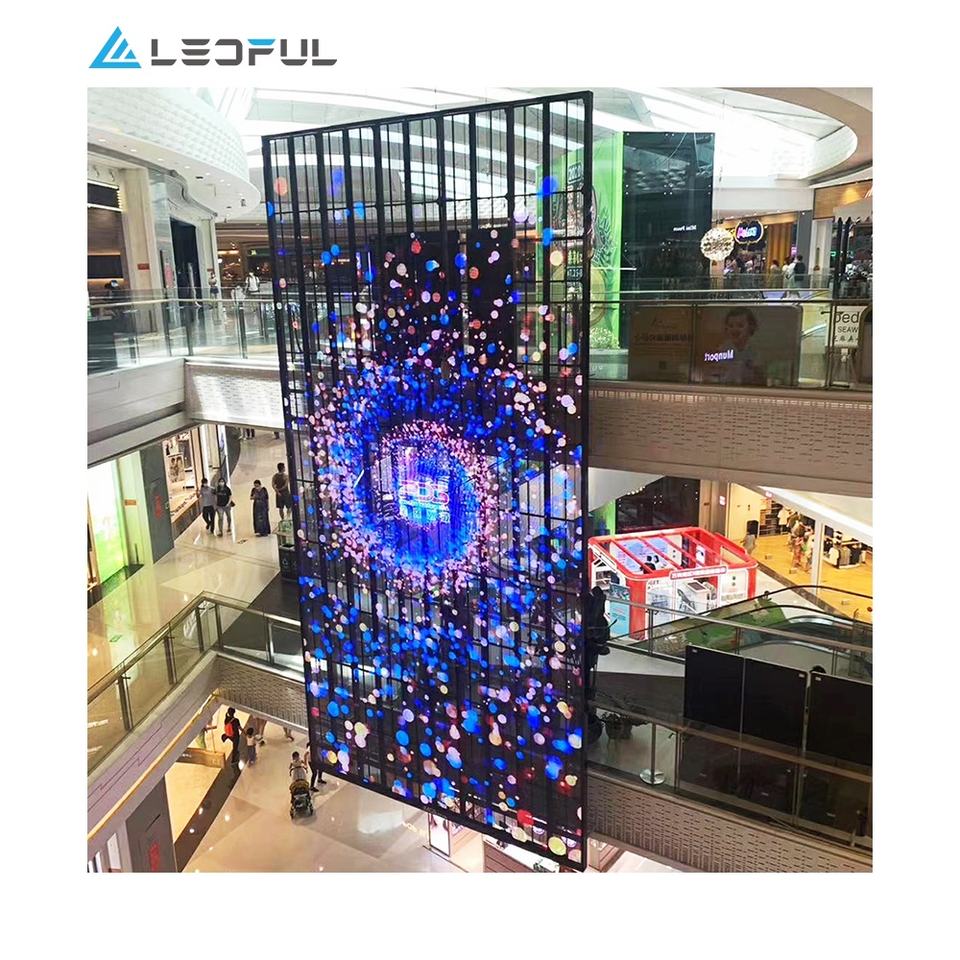 Rejilla de malla RGB P3.91 de alto brillo a todo color, gran pantalla de panel de pantalla LED de cristal transparente para interiores
