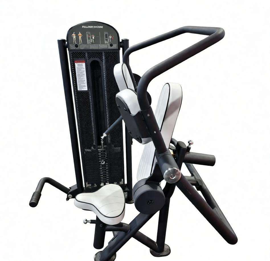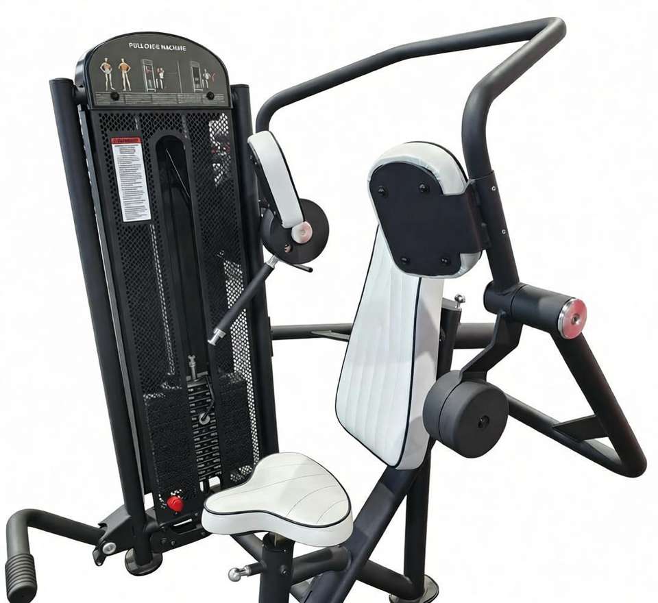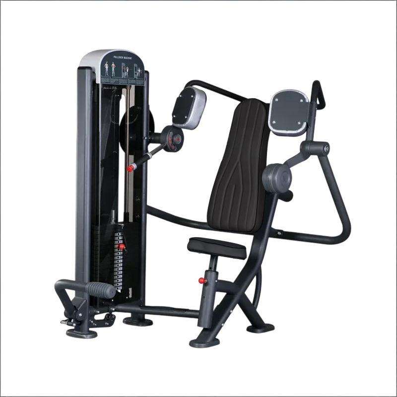 Equipo de gimnasio comercial con pila de pesas seleccionables para entrenamiento de espalda y pecho, con selección de carga por pasador, para pullover sentado y ejercicios de brazo.