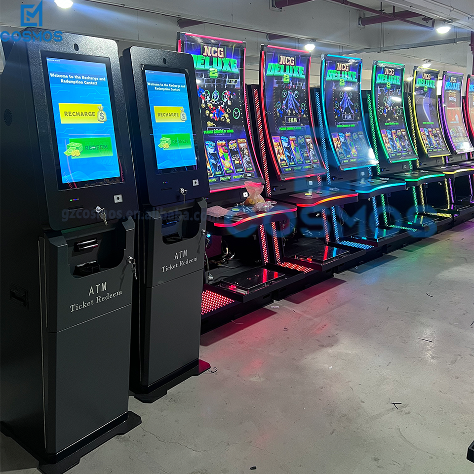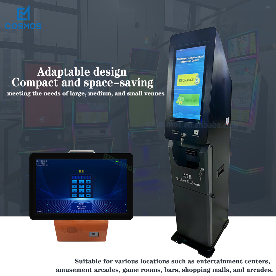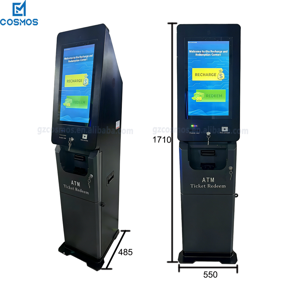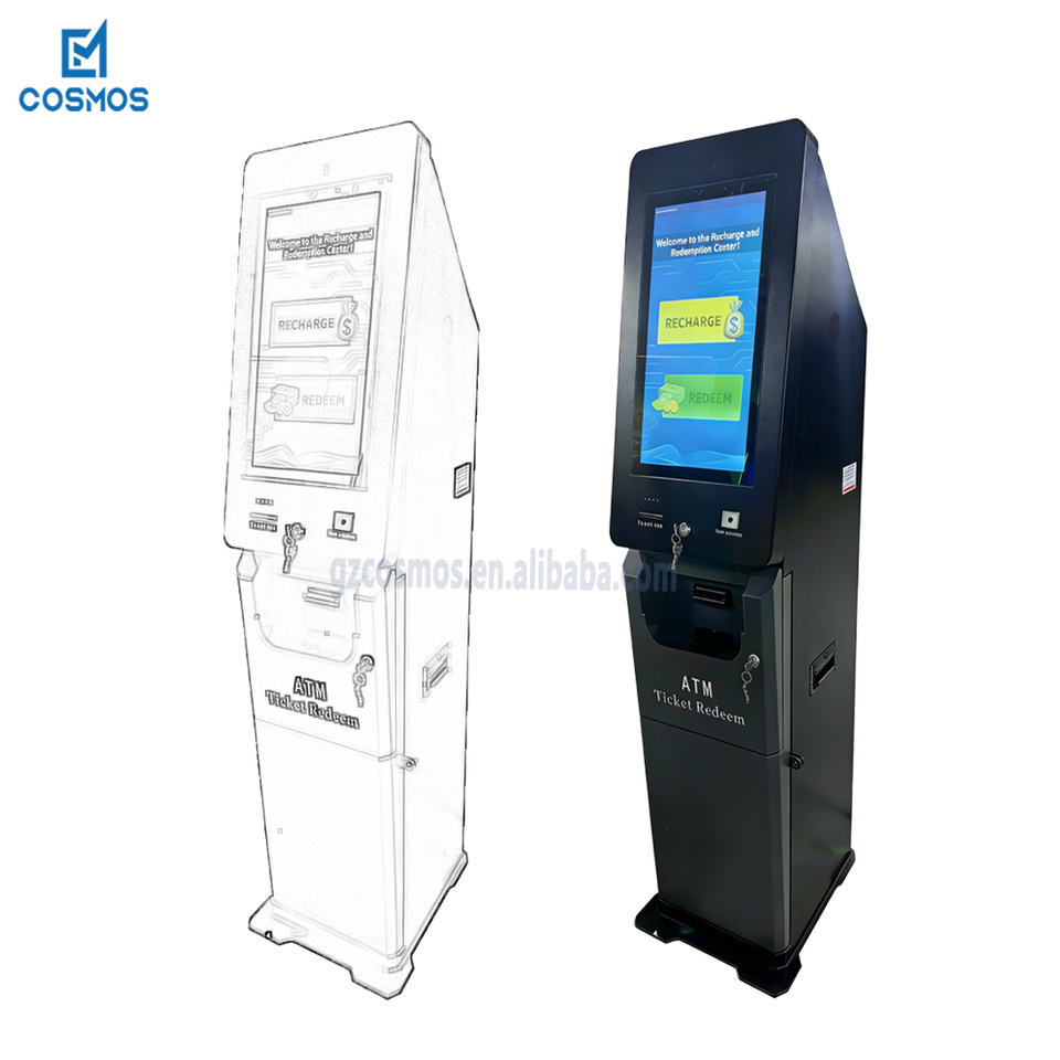 Terminal de autoservicio para canje de efectivo y boletos/Quiosco ATM con escaneo de códigos de barras para máquinas de juegos de habilidad en gabinete metálico vertical