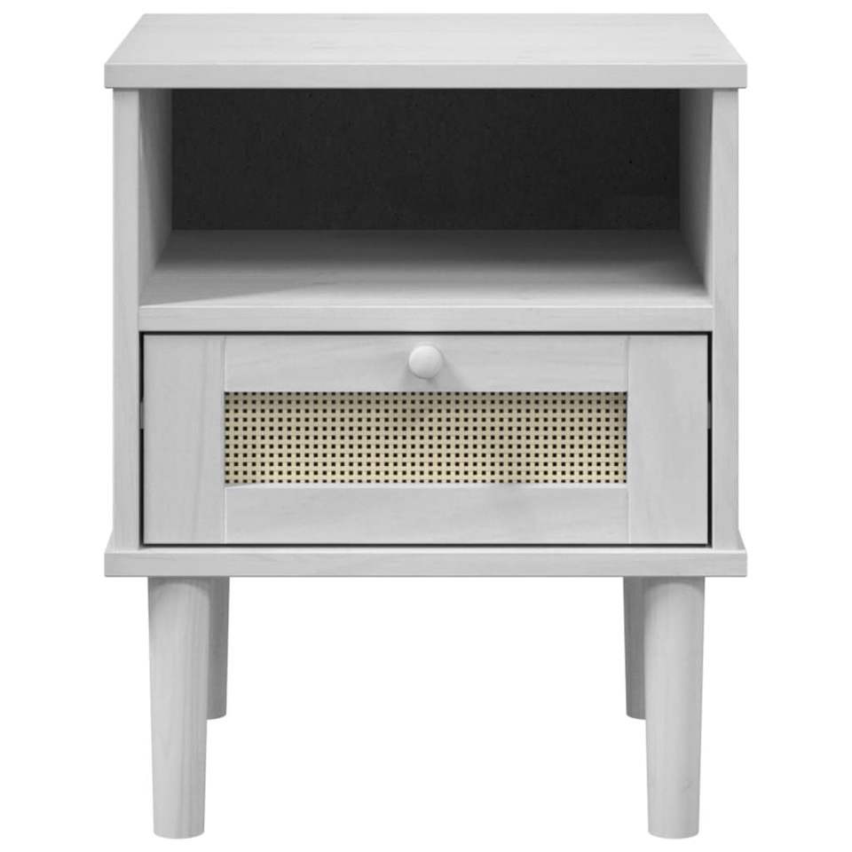 Mesita de noche de pino de madera maciza con aspecto de ratán Senja, muebles de dormitorio blancos de 15,7 "x 13,8" x 18,9"