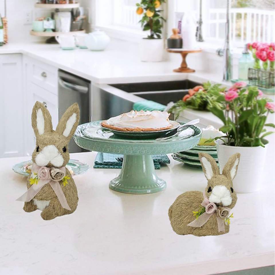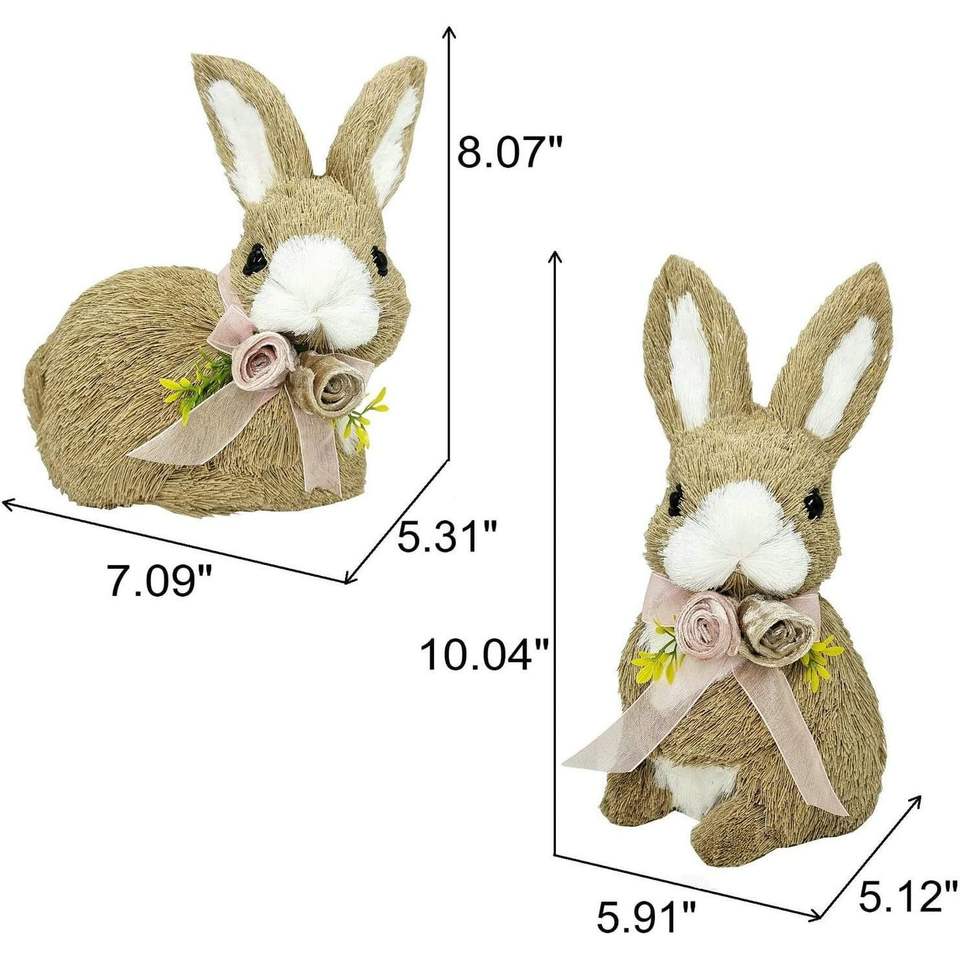 Juego de 2 Conejos de Pascua de Sisal de 10 Pulgadas con Lazo Floral, Animales Decorativos para el Hogar, Decoración Floral de Primavera