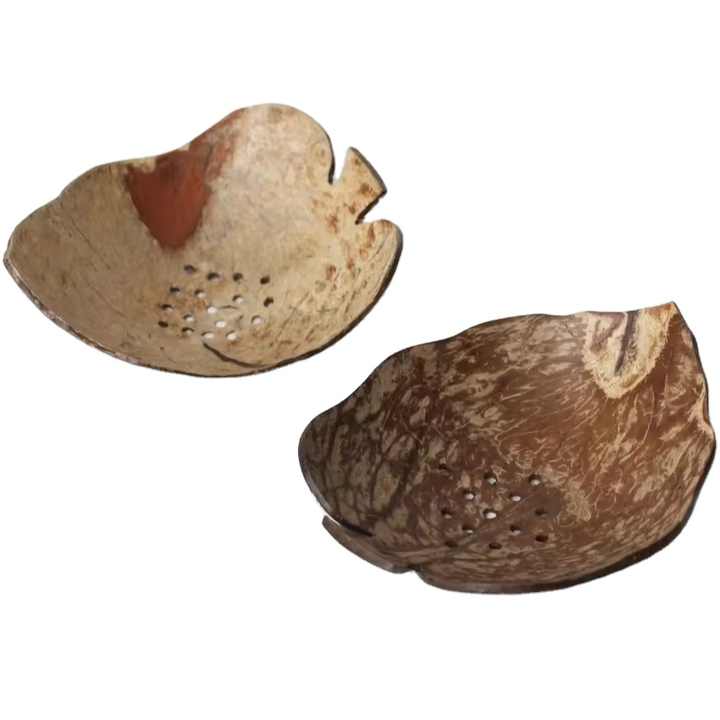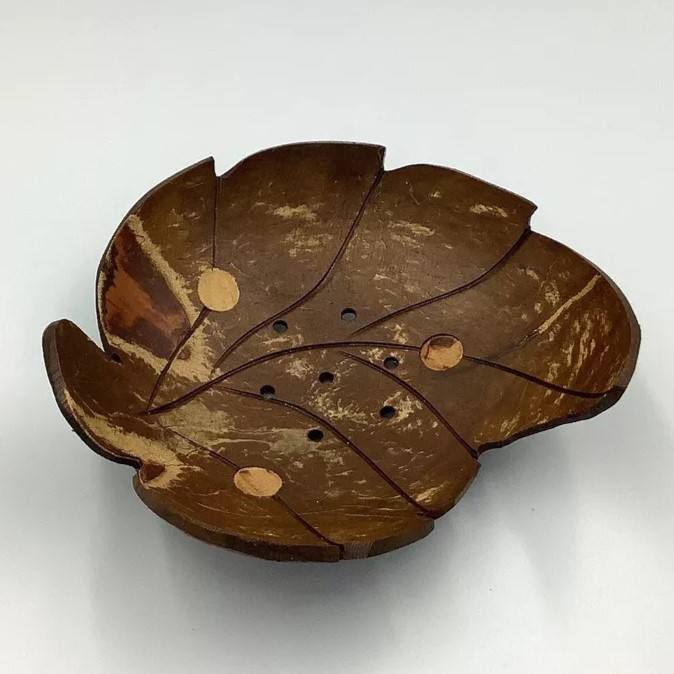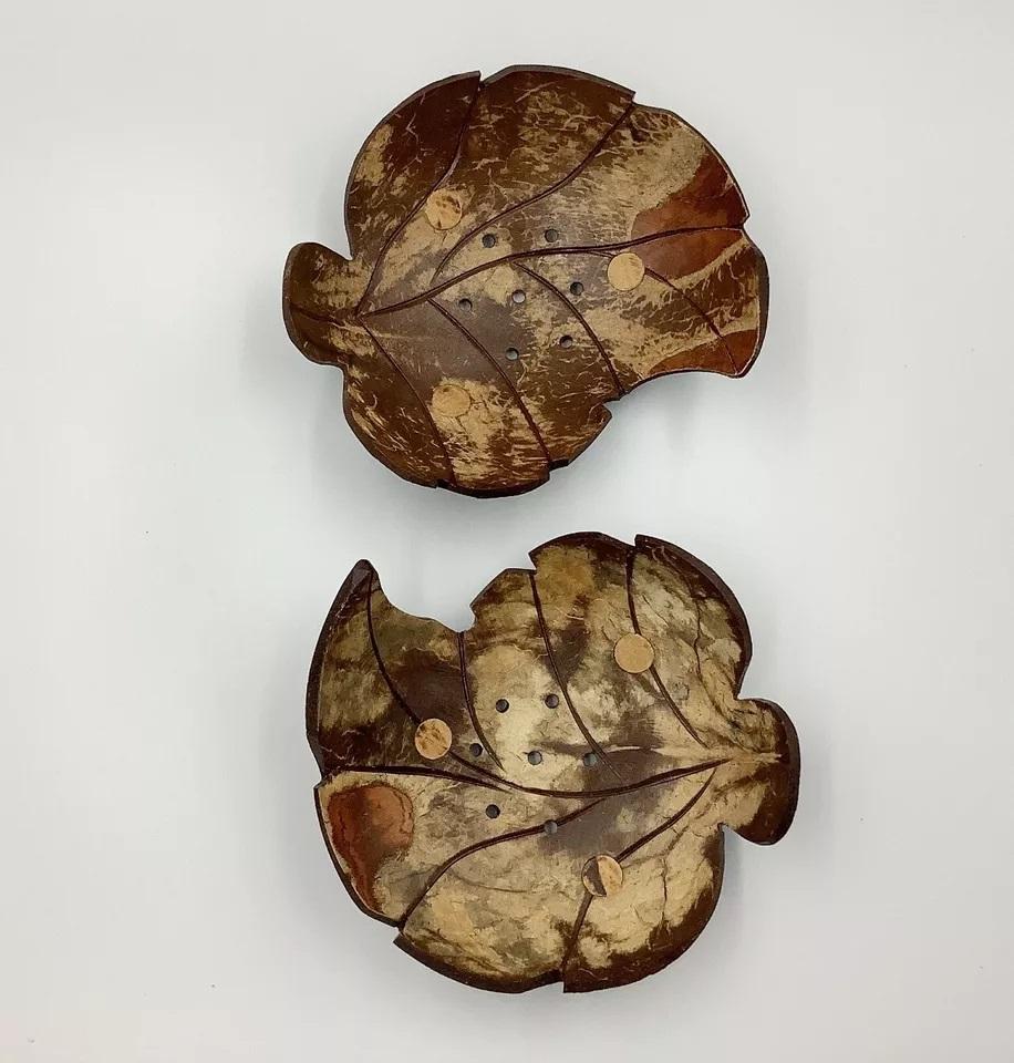 Juego 2 jabonera de cáscara de coco sostenible hecha a mano hoja Floral forma única marrón oscuro logotipo personalizado aplicación de baño rústico