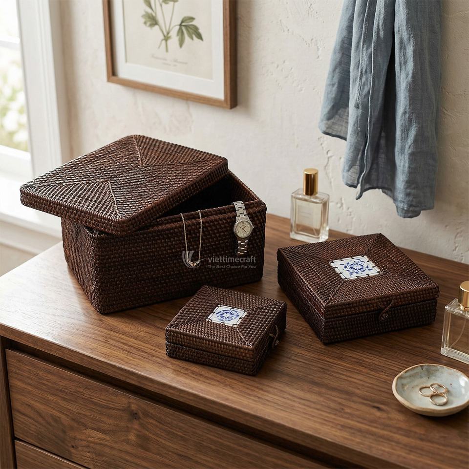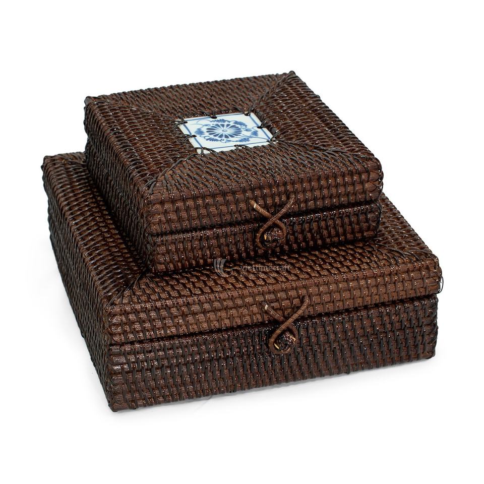 Juego de 2 Cajas de Almacenamiento de Mimbre y Ratán con Detalles de Cerámica, Caja Decorativa de Mimbre con Tapa, Venta al por Mayor, Vietnam