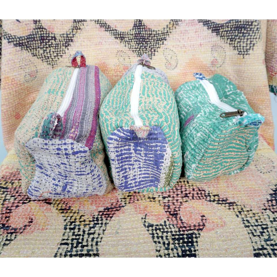 Juego de 3 neceseres acolchados con estampado floral, grandes neceseres de tela india kantha, juego de 3 bolsas, neceseres de viaje para maquillaje, estuche de cosméticos a la moda.