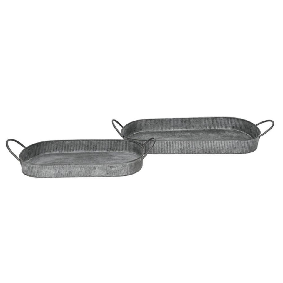 Juego de 2 bandejas rústicas de metal galvanizado plateado con borde y asas de cobre, bandeja decorativa para exhibición en la cocina y decoración del hogar.