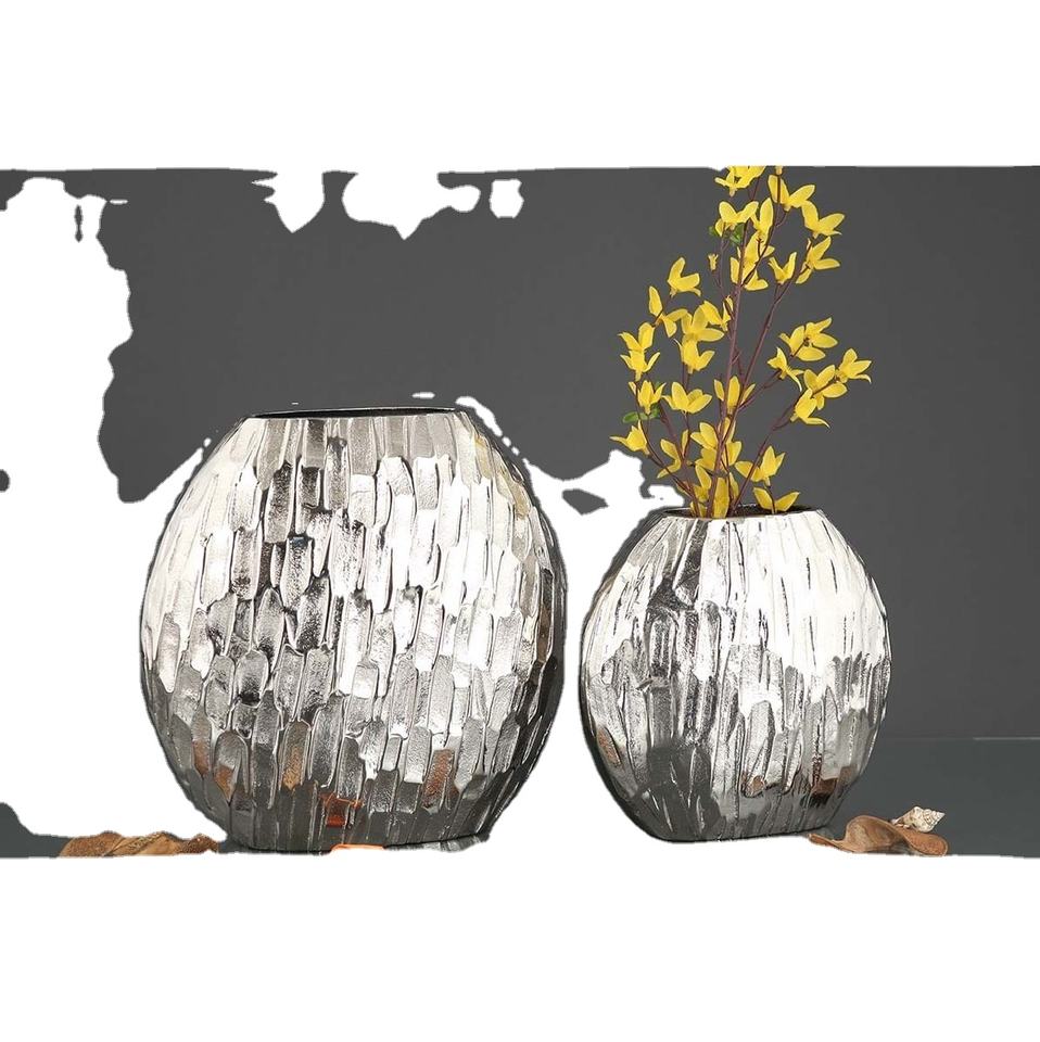 Juego de 2 jarrones de flores redondos martillados brillantes chapados en níquel plateado de acero para decoración del hogar