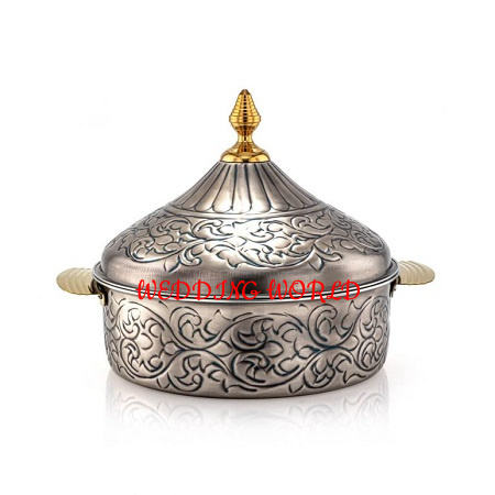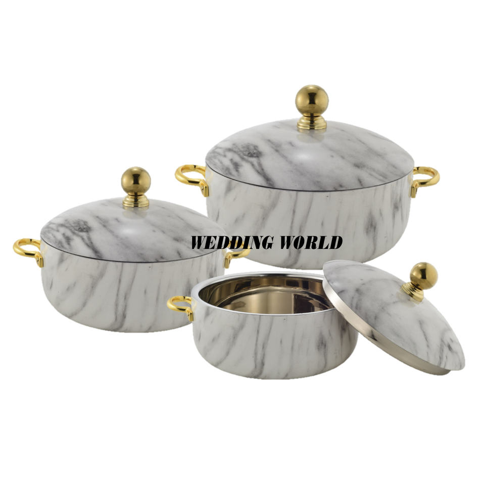 Juego de tres ollas de diseño de mármol cazuela hecha a mano de primera calidad forma redonda nuevo calentador de alimentos de Metal de lujo