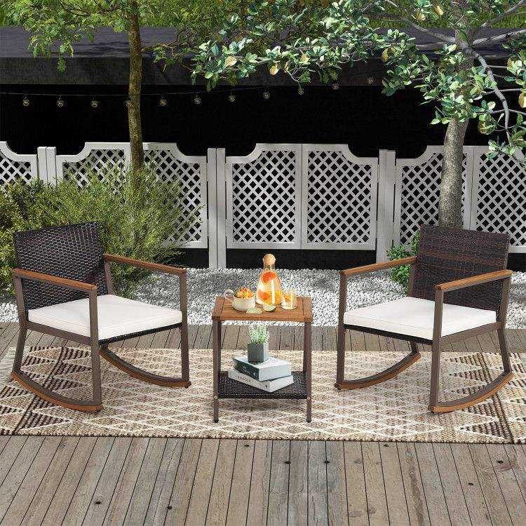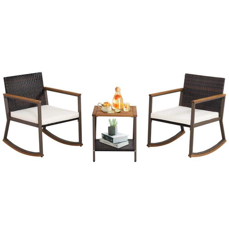 Juego de 3 Sillas Bistró de Ratán con Mesa de Centro y Cojines para Entretenimiento en el Jardín